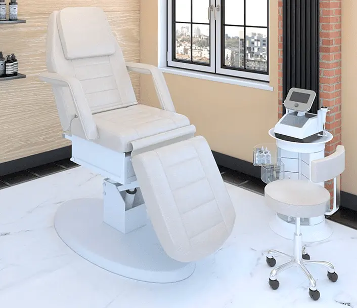 Каркас из прочной стали установлен на надежное основание, закрытое пластиковой накладкой. Металлические элементы покрыты порошковой краской для защиты от влаги, коррозии и косметических средств. Наполнитель педикюрного кресла – упругий поролон. Обшивка из качественной экокожи обладает водостойкими свойствами. Поверхность легко чистится и не боится дезинфицирующих средств.