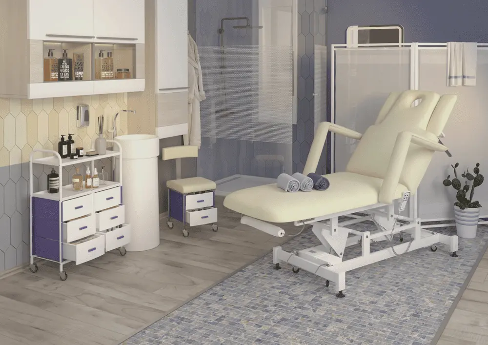 Вы можете заказать кушетку на подпятниках (стандартная комплектация) или на колесной базе.