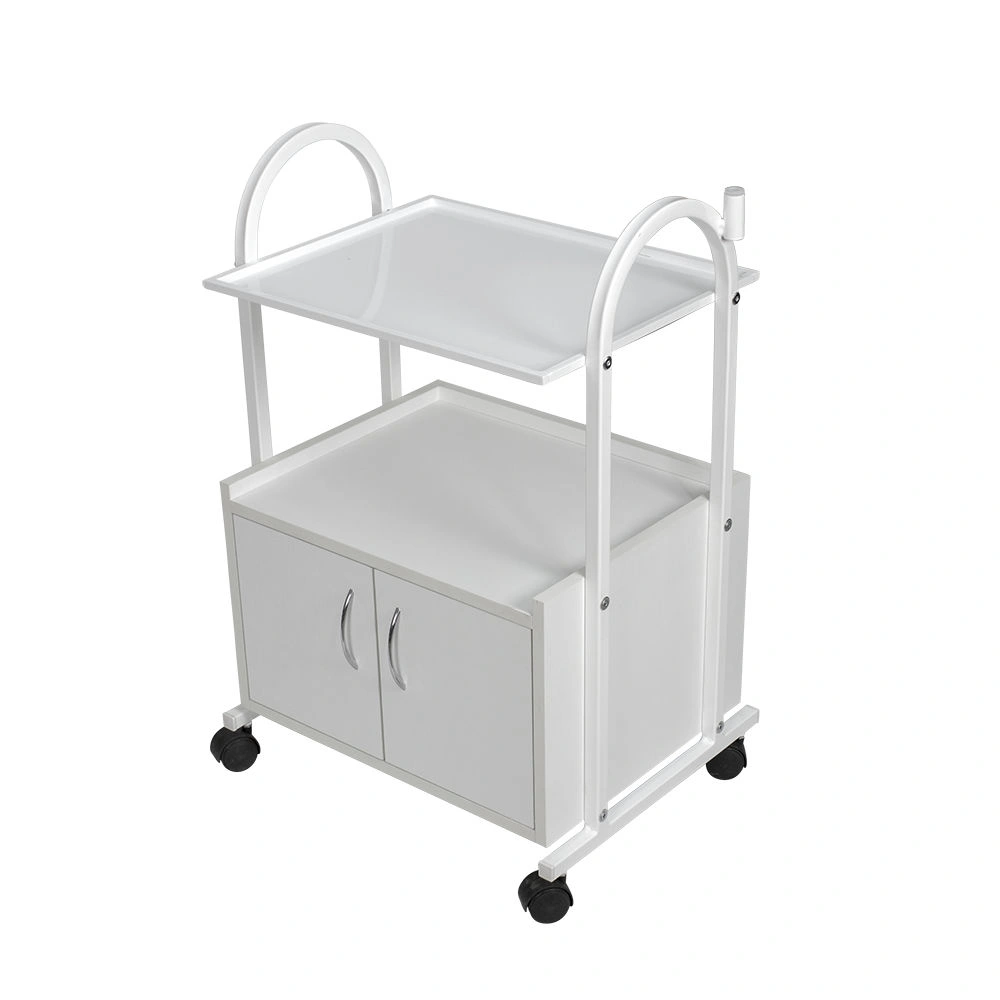 Купить косметологическую тележку МД-103 можно в нейтральном белом цвете, который будет сочетаться с любой палитрой помещения и базового оборудования. Полка и элементы каркаса выполнены из прочного металла, окрашенного защитной краской. Шкафчик выполнен из качественной ДСП с влагоотталкивающим ламинированным покрытием. Для удобного перемещения модель комплектуется вращающимися колесами из прочного пластика.