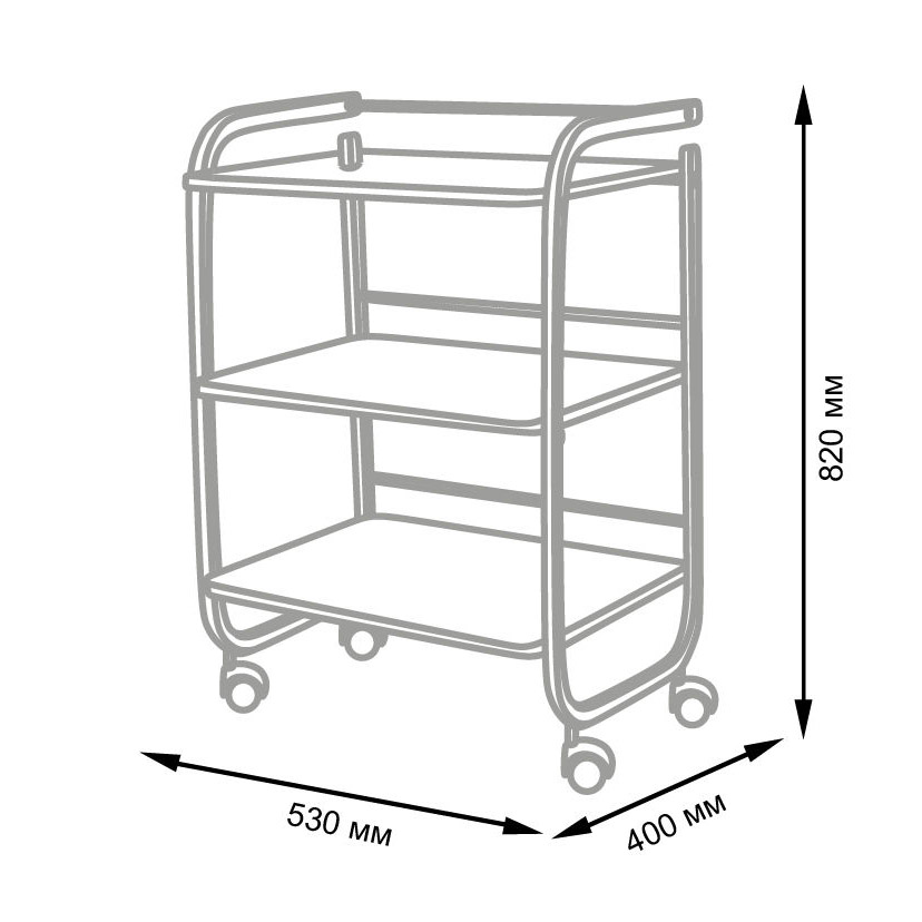 Комплектация: металлический каркас, три стеклянные полки с бортиками, колеса.