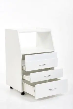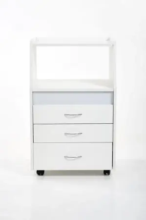 Косметологическая тележка разделена на 3 выдвижных ящика и одну полку. Верхний ящик оснащен УФ-лампой (8Вт) для хранения стерилизованных инструментов. В остальных ящиках достаточно места, чтобы разложить приспособления мастера. Полка предназначена для установки аппаратов или принадлежностей первой необходимости. Перемещать косметологическое оборудование можно с помощью вращающихся колес.