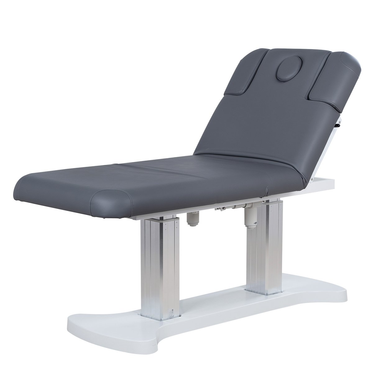 В спинке СПА-кушетки есть специальный вырез для лица, который при необходимости можно закрыть подушкой. Подлокотники регулируются по высоте и адаптируются под клиента — обеспечивая удобство в положении лёжа на животе. Благодаря единому ложу без разделения на секции, кушетка подходит абсолютно для всех процедур сразу в трёх направлениях: косметология, спа и массаж. Комплектуется ручным или ножным пультом — на выбор!
