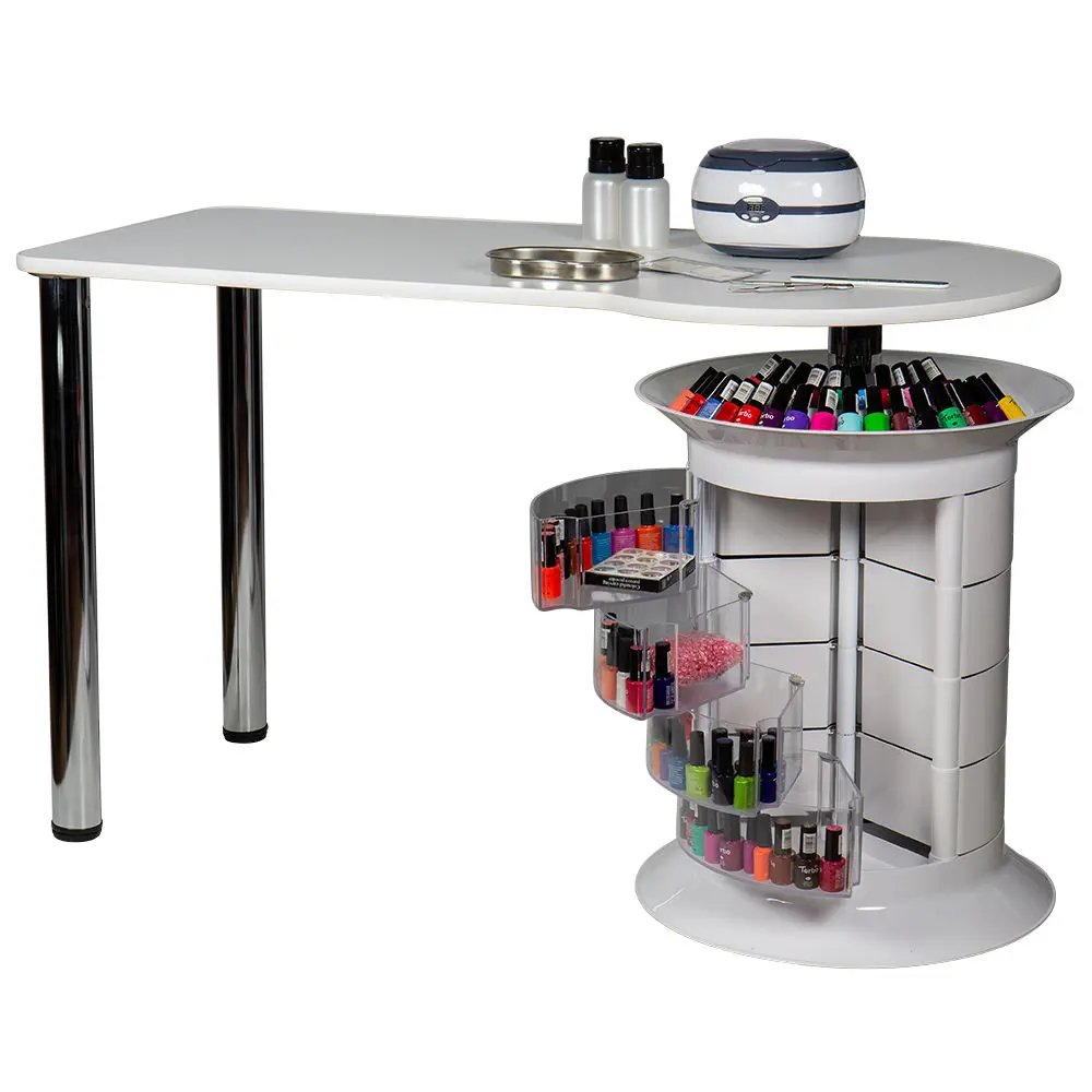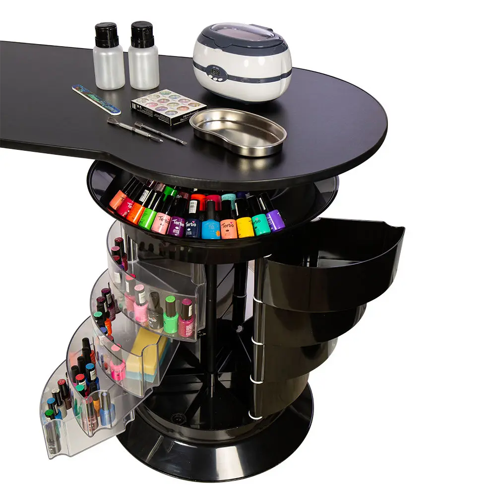 Тумба состоит из 12 выдвижных ящиков, где поместятся приспособления и расходные материалы мастера. Четыре прозрачных ящика можно использовать для инструментов, часто используемых в работе. Функция вращения тумбы поможет быстро найти необходимые принадлежности. Над тумбой есть практичная полочка, разработанная для хранения лаков. Ширина столешницы позволит установить сопутствующее оборудование.