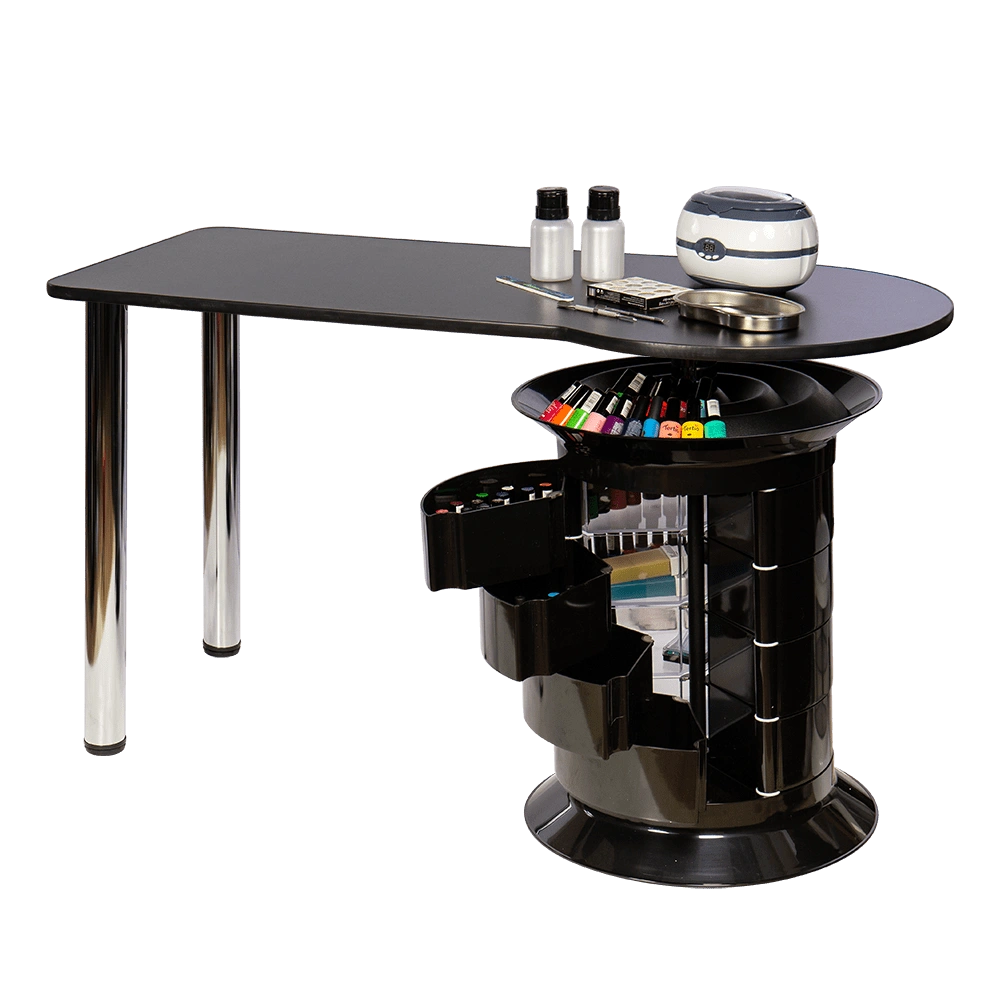 Инструменты, расходные материалы и аксессуары можно хранить в удобных выдвижных ящичках. Мастер сможет с легкостью находить необходимые приспособления, ведь тумбу можно вращать вокруг своей оси. Для лаков над тумбой предусмотрена удобная полочка. С широкой столешницей есть возможность поставить необходимое сопутствующее оборудование, не загромождая рабочую поверхность.
