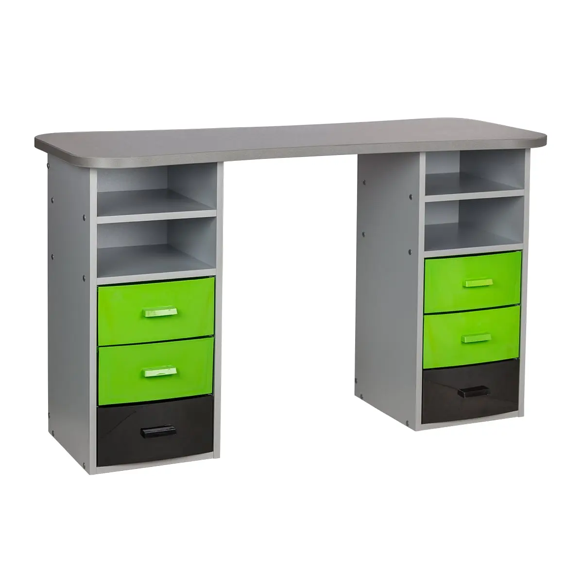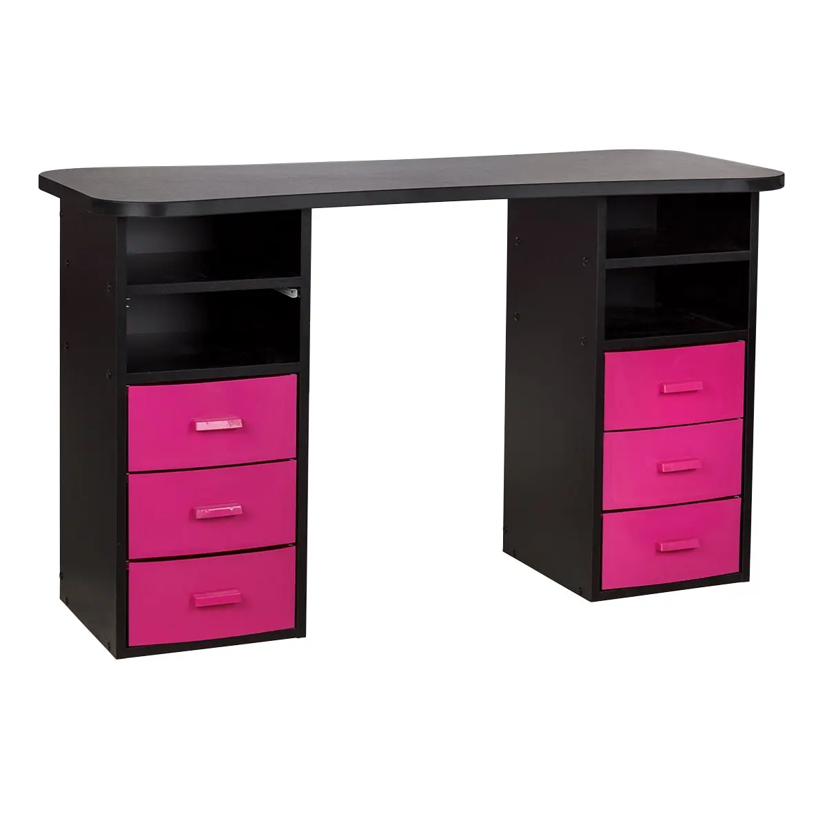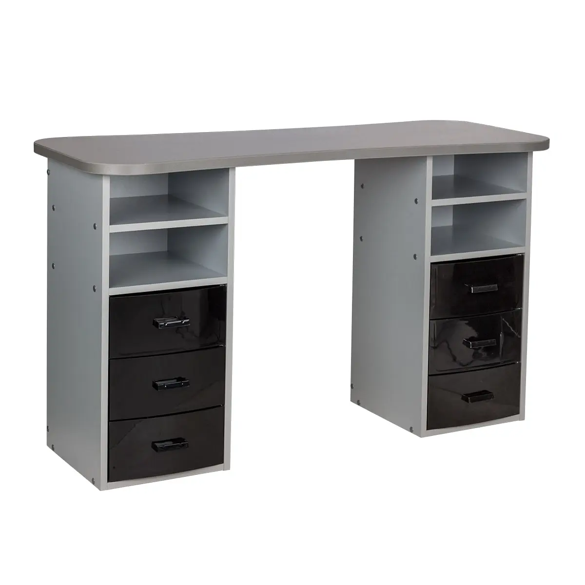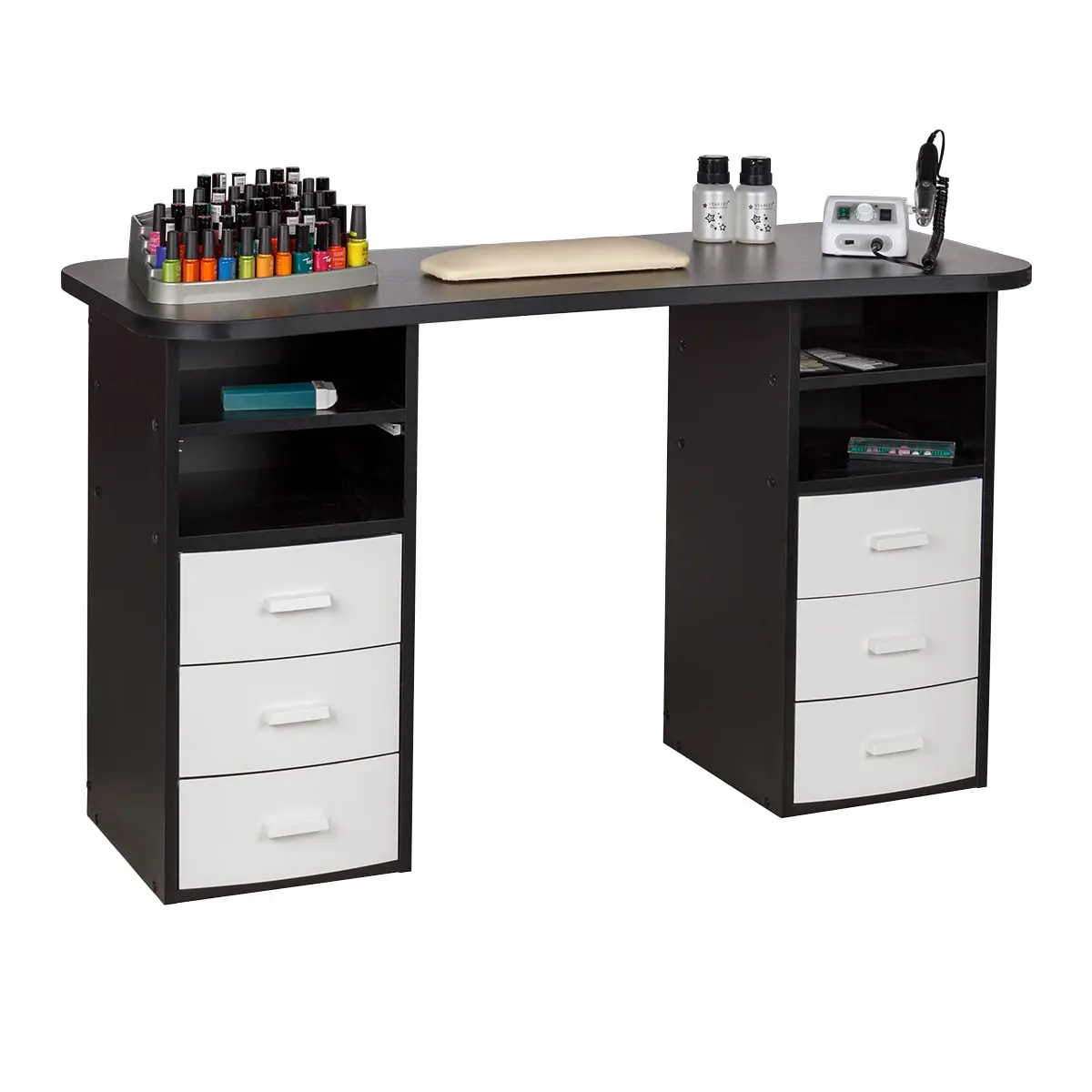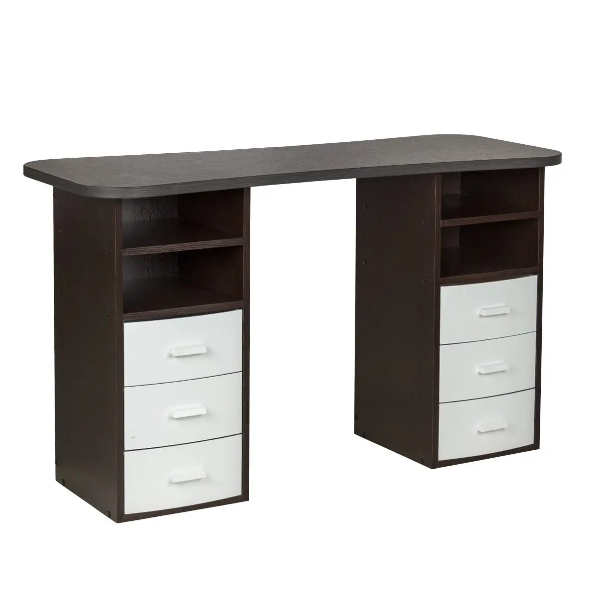 Столешница с плавными изгибами открывает легкий доступ к рукам клиента. На широких краях закругленной формы мастер может поставить аппарат, инструменты и расходные материалы. Под столешницей есть две тумбы по две ниши и по три ящика в каждой. При необходимости ящики можно вынимать.