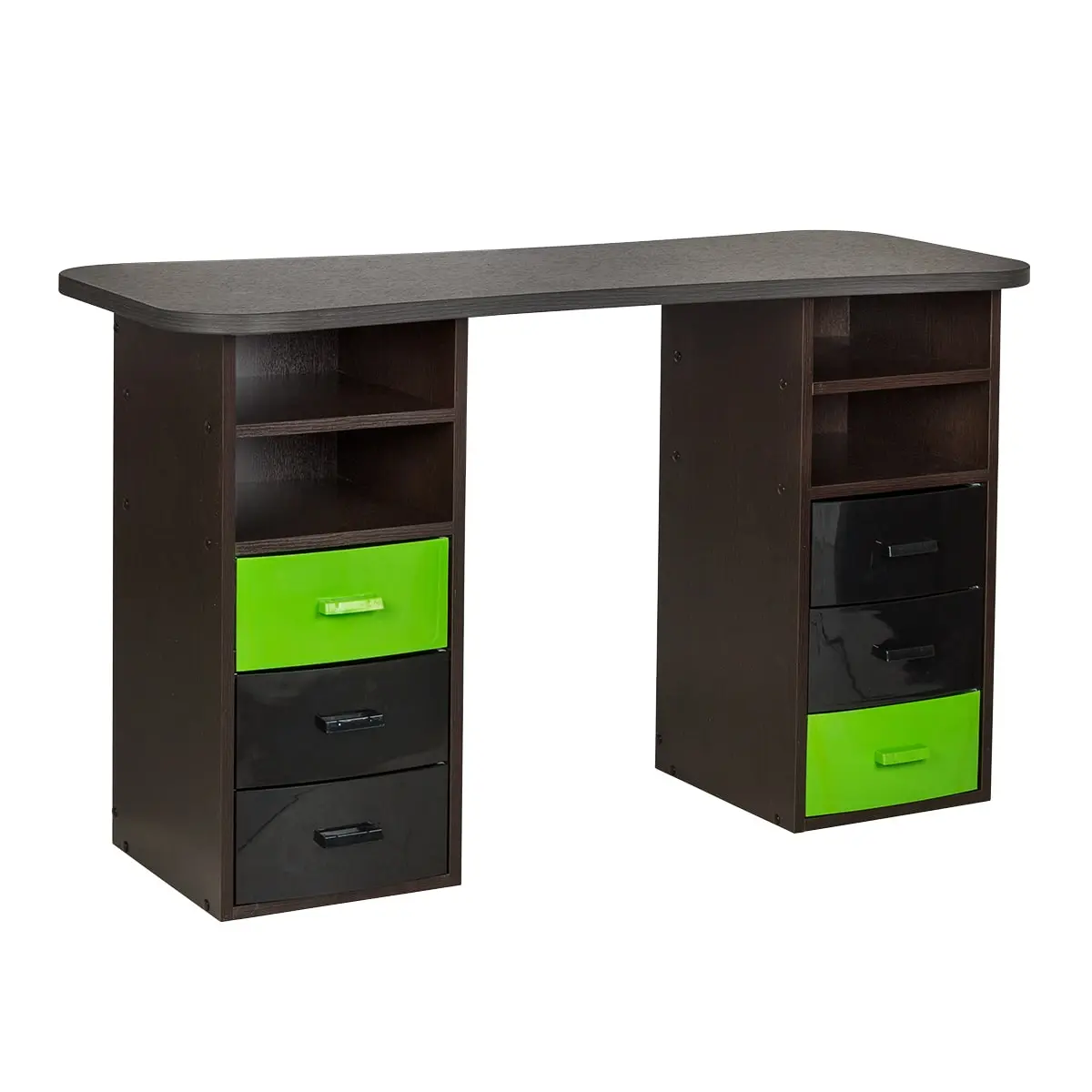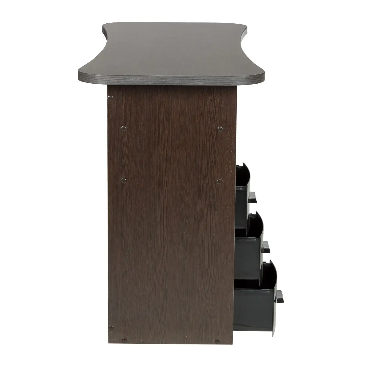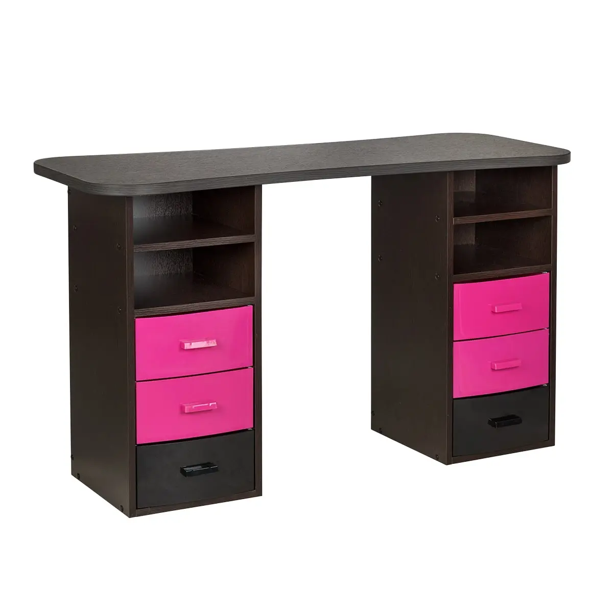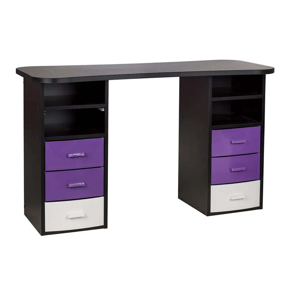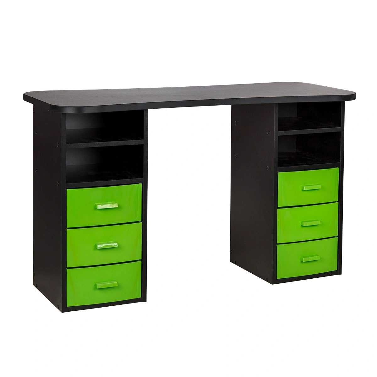 Столешница с плавными изгибами открывает легкий доступ к рукам клиента. На широких краях закругленной формы мастер может поставить аппарат, инструменты и расходные материалы. Под столешницей есть две тумбы по две ниши и по три ящика в каждой. При необходимости ящики можно вынимать.