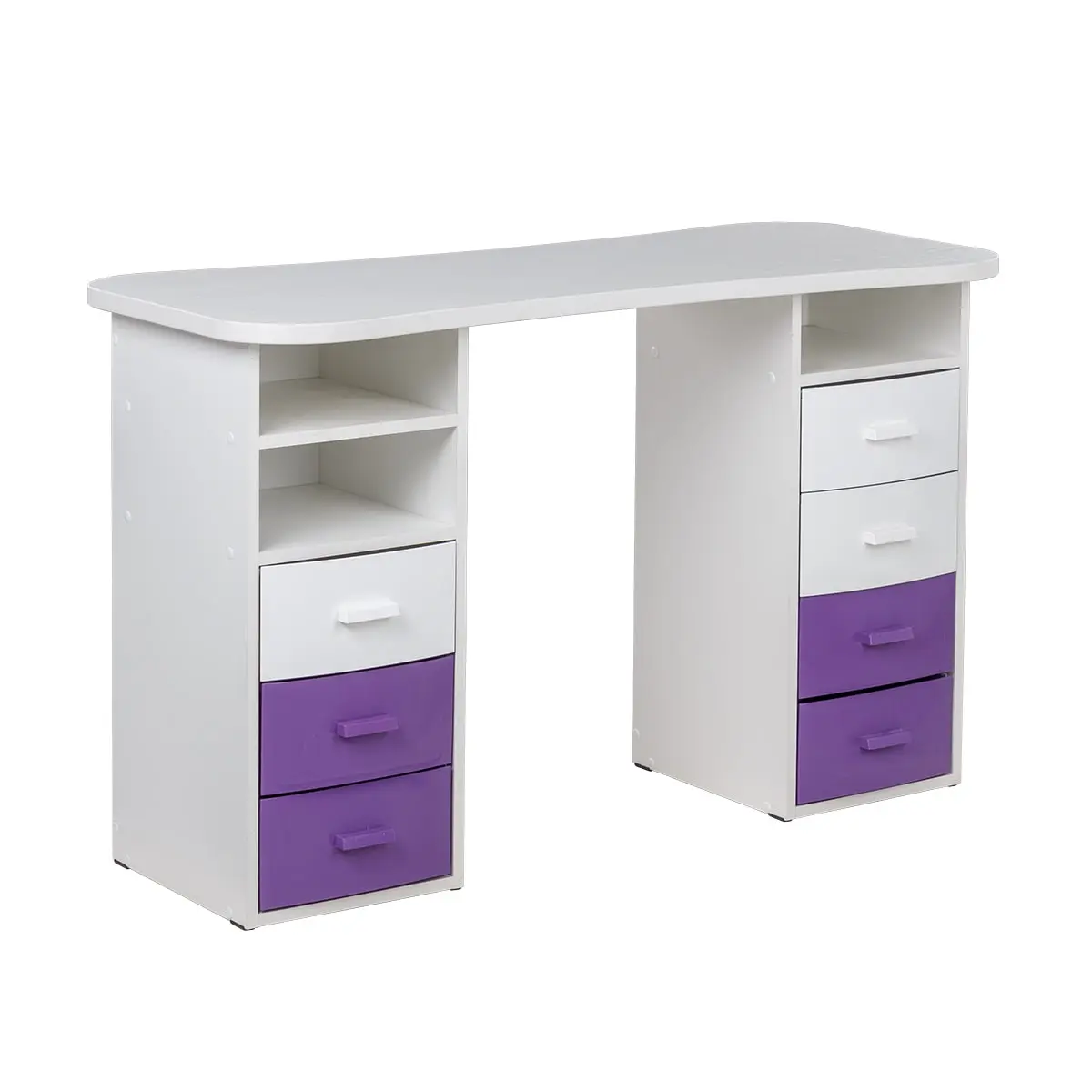 Корпус тумбы, полки и столешница маникюрного стола выполнены из ЛДСП высокого качества. Кромка из ПВХ надежно защищает торцы маникюрного стола от сколов и проникновения влаги. Специальные подпятники не допустят царапин на полу. Ящики из прочного пластика не бояться легкого механического воздействия и влияния моющих средств. Можно заказать разные комбинации расцветок ящиков из доступных цветов.
