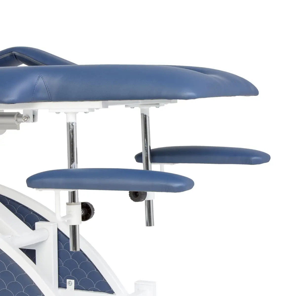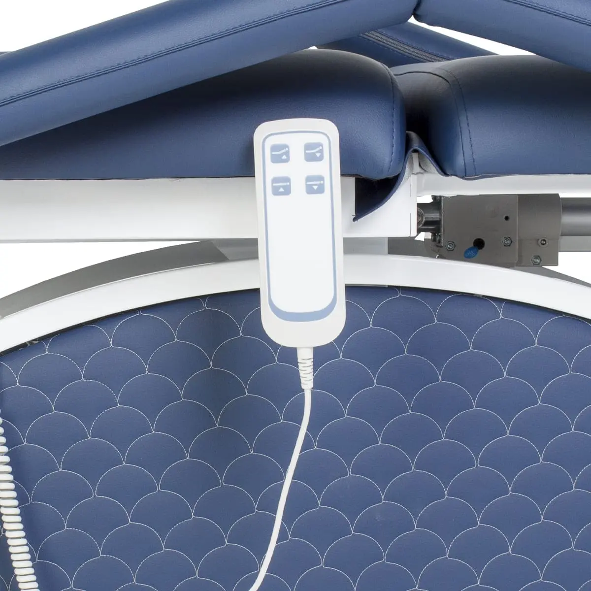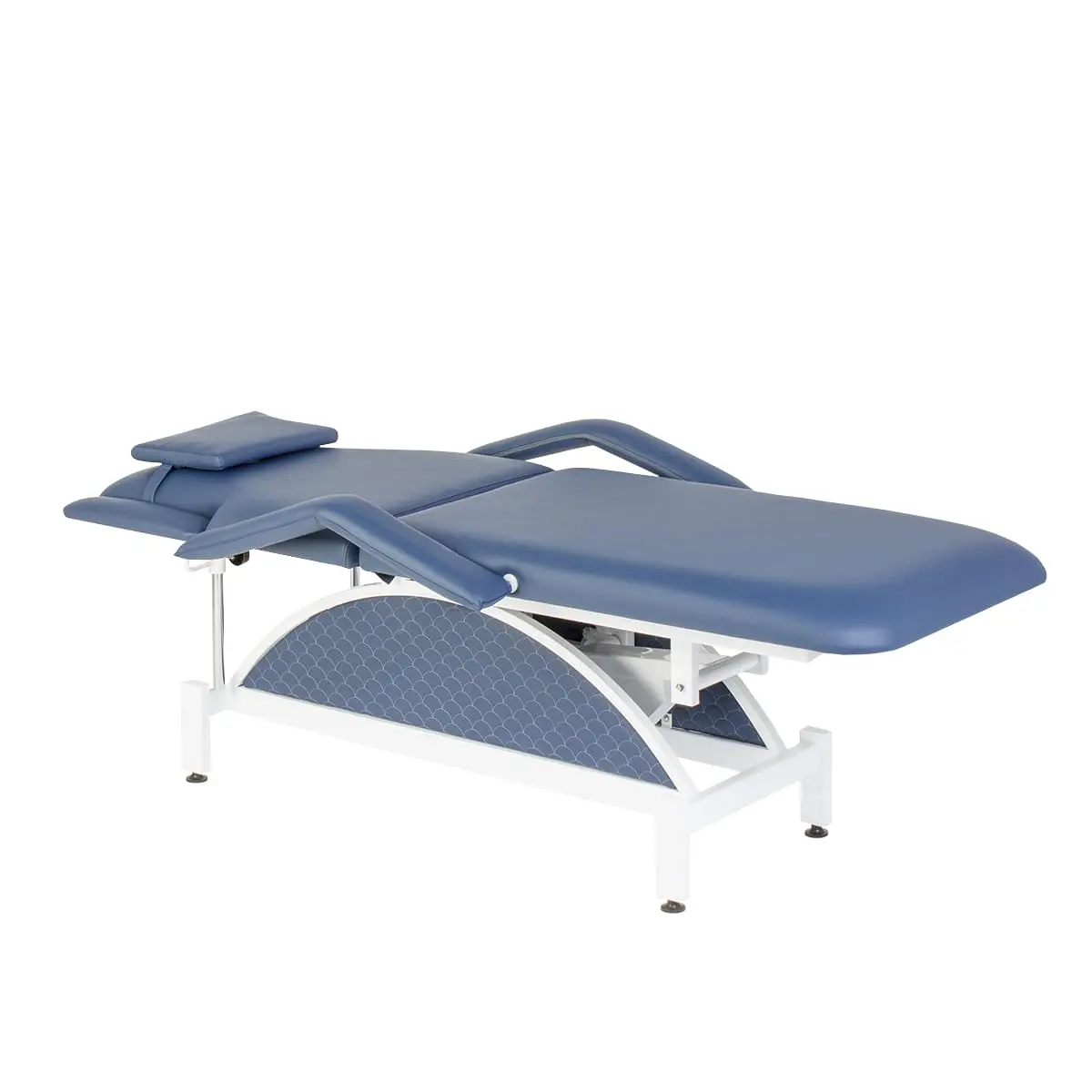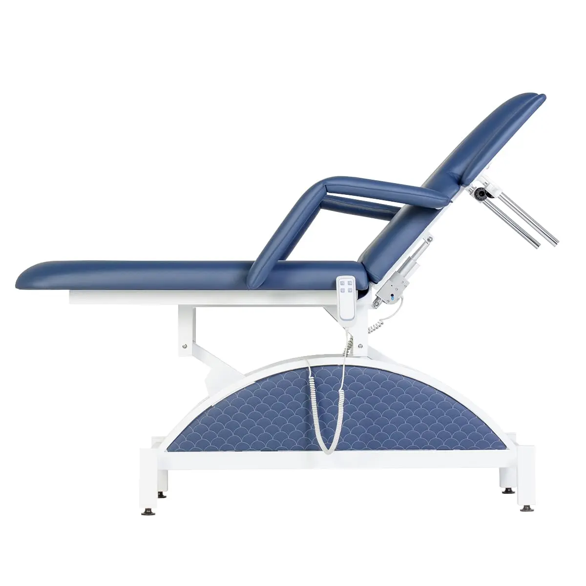 Комплектация: кушетка, подлокотники, съемная подушка, металлические элементы каркаса и основания, электропривод с двумя электромоторами и дистанционным пультом управления.