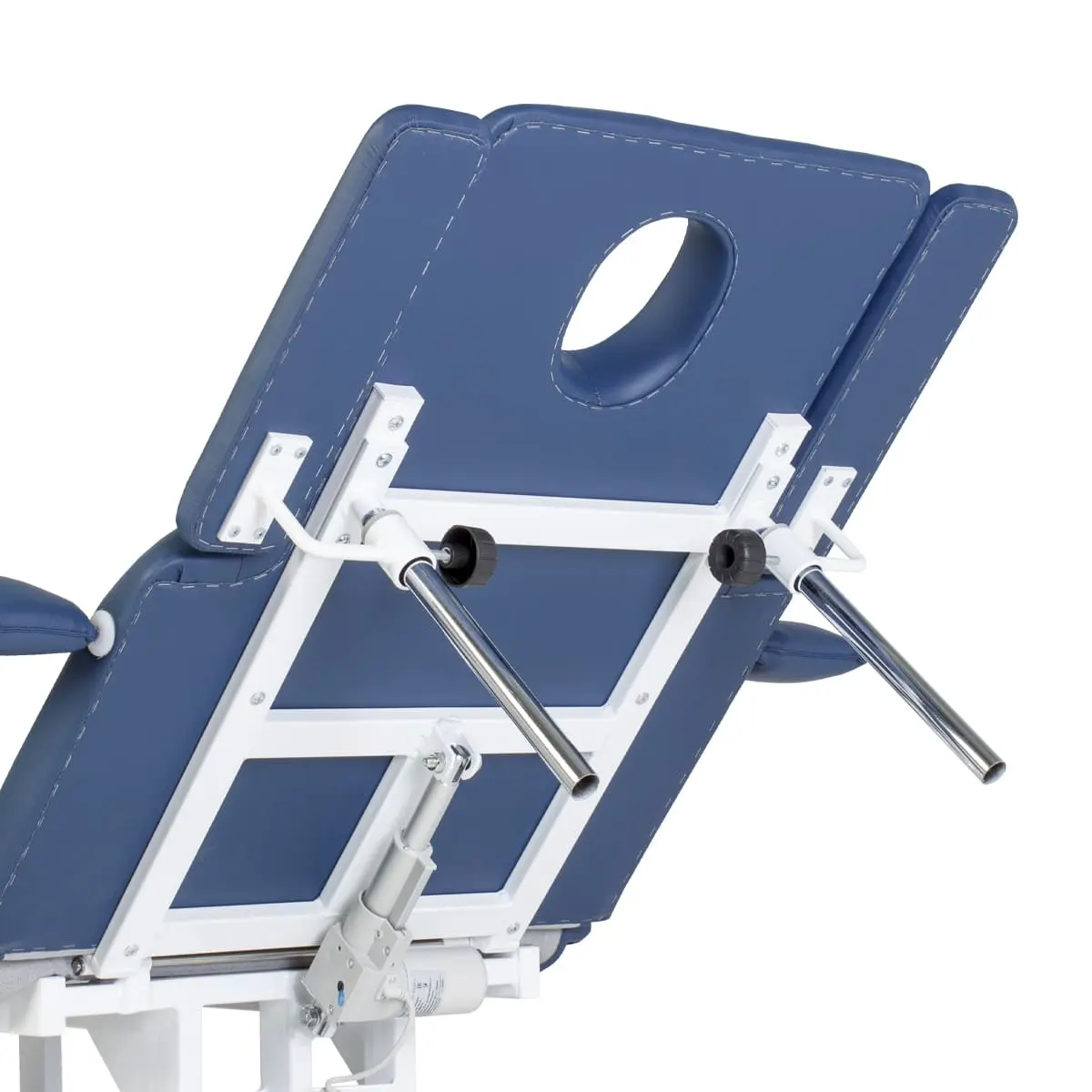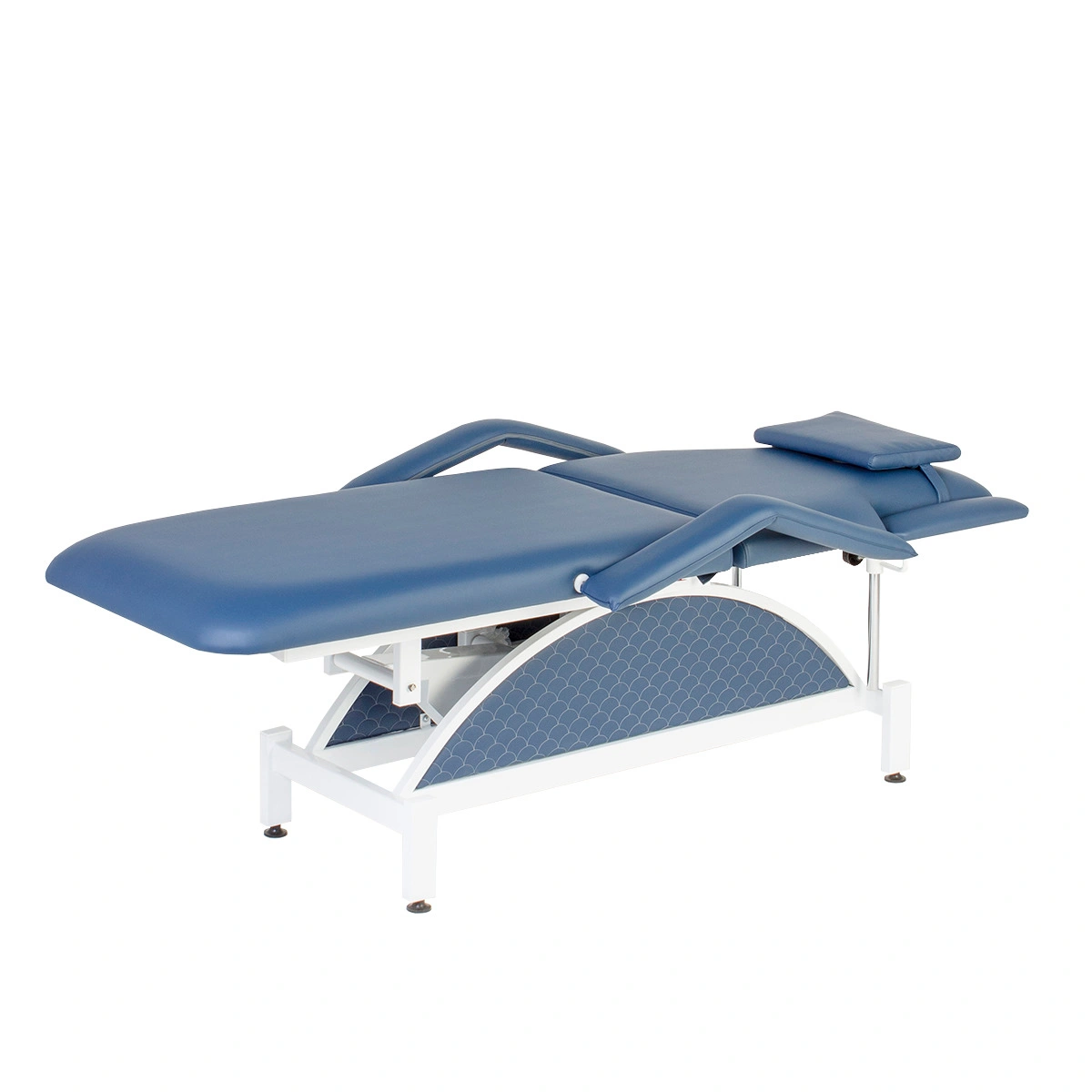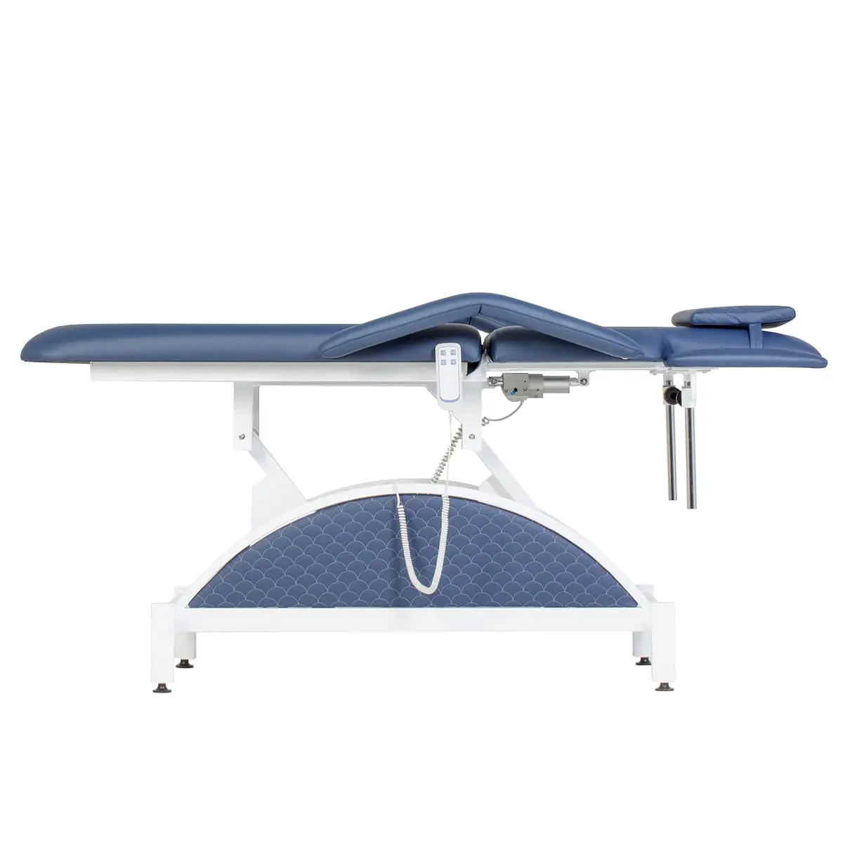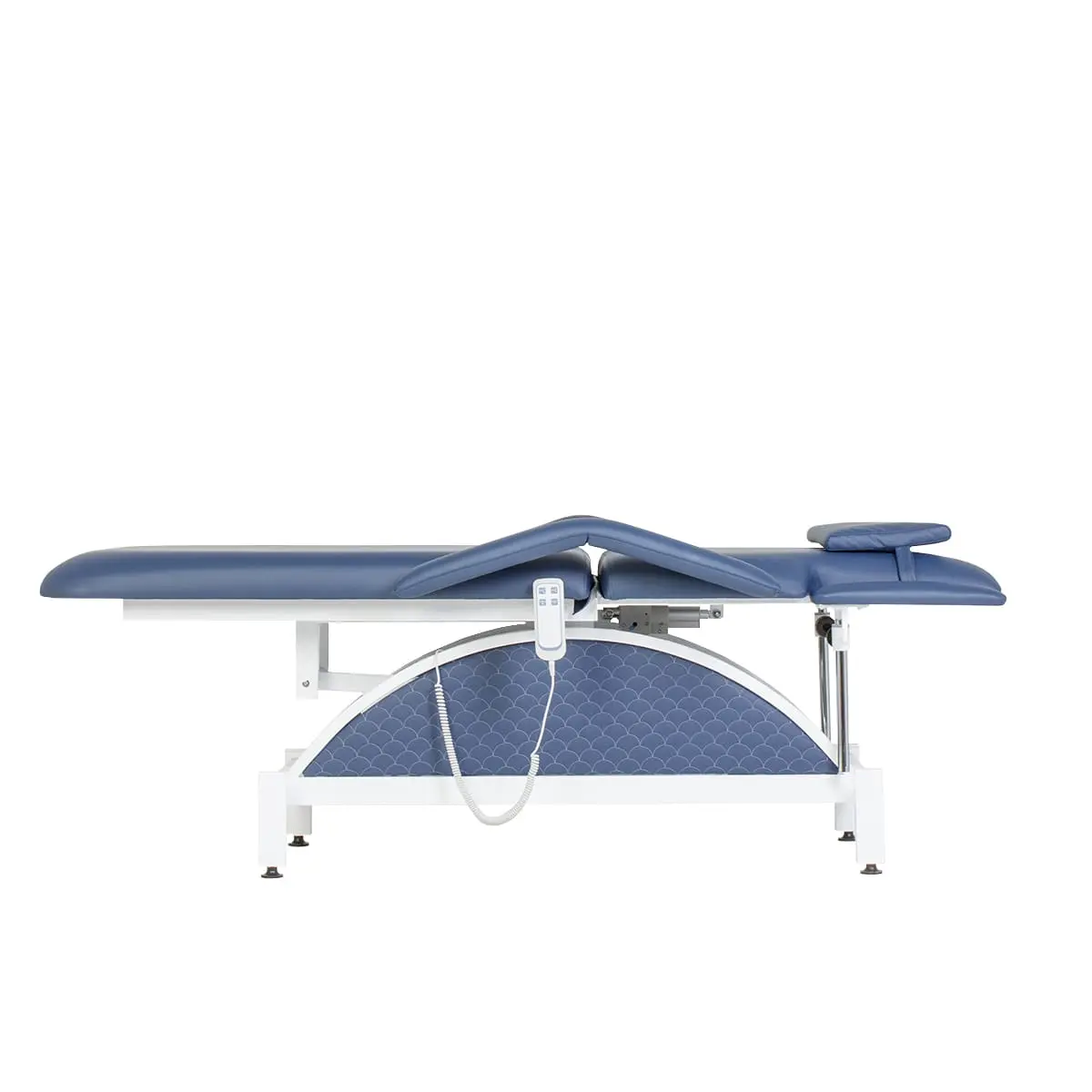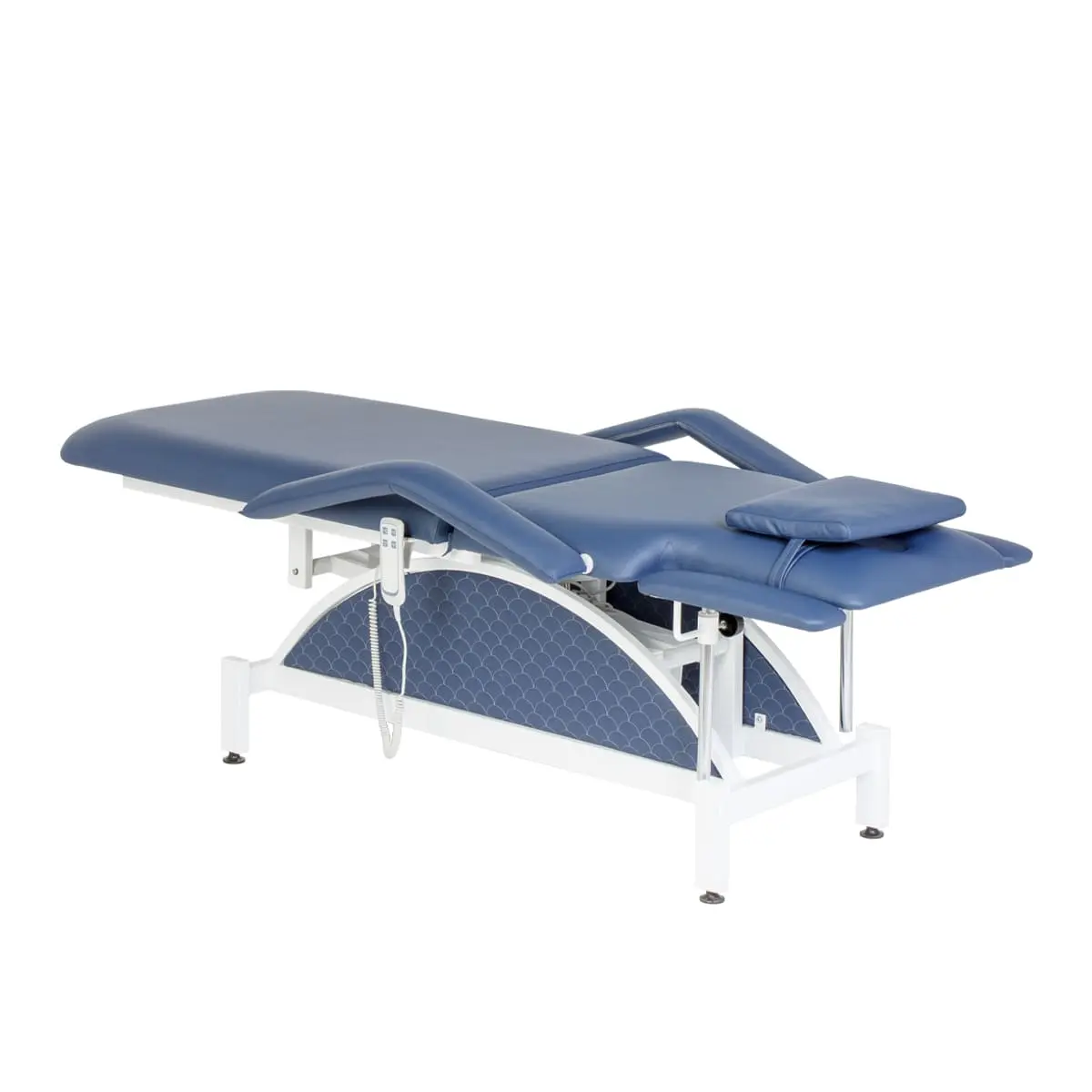 Кушетка разделена на два мягких сегмента, положение которых регулируется. С помощью двух встроенных электромоторов можно дистанционно регулировать угол наклона спинки и высоту кушетки. В комплект поставки входит удобный пульт управления электроприводом. Каркас и основание из металла с защитным покрытием.