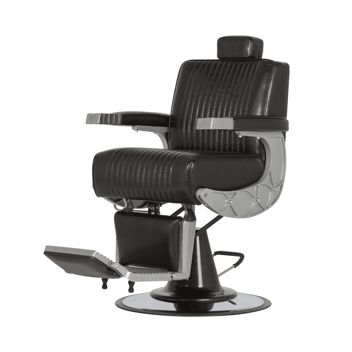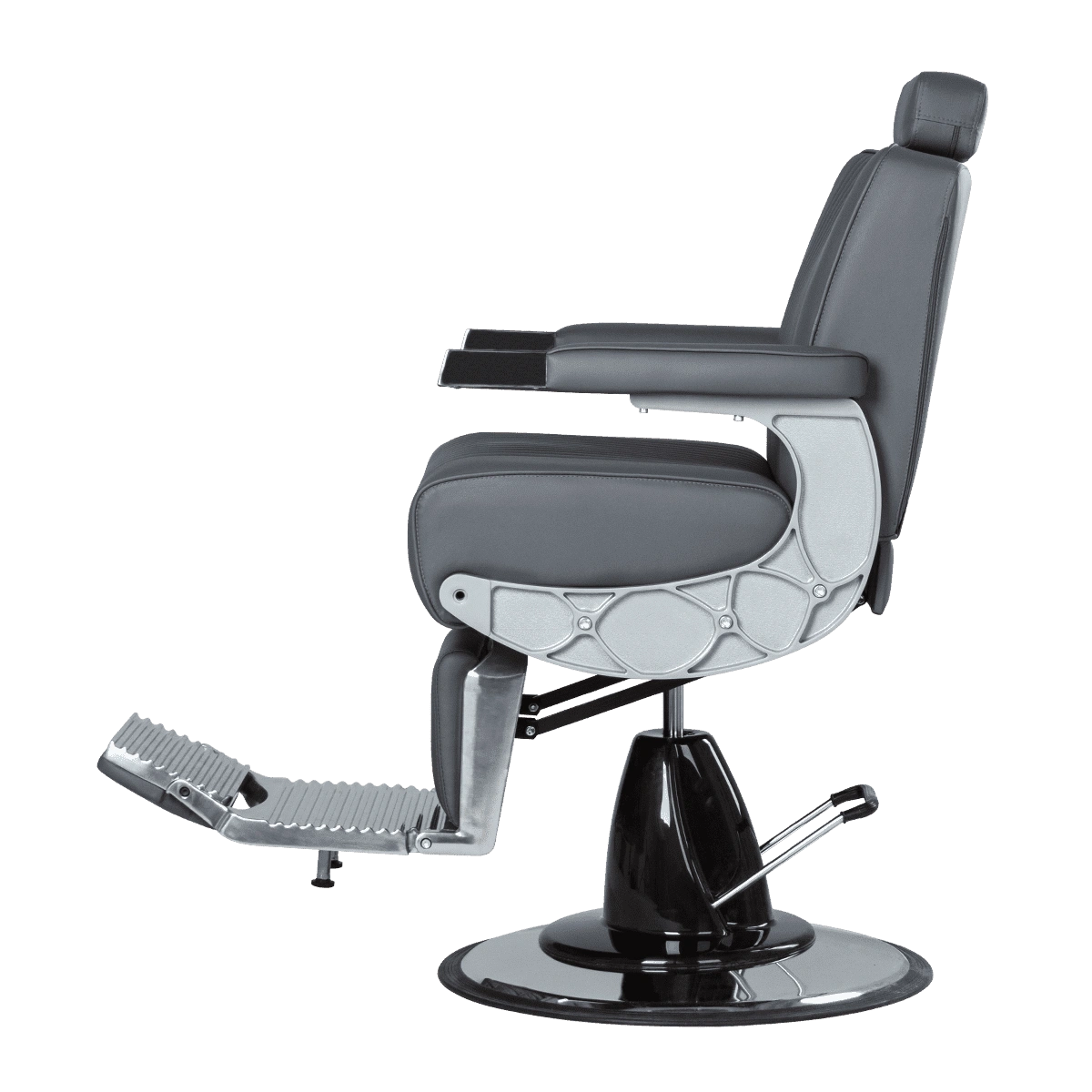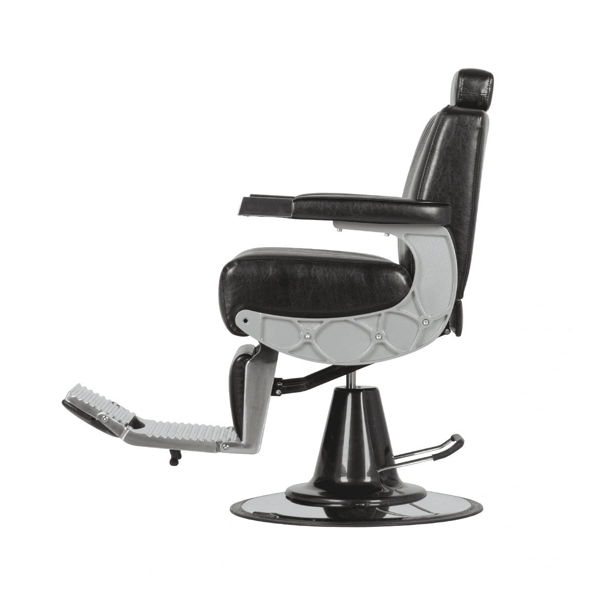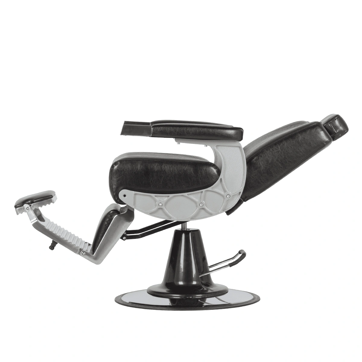 Подъем кресла осуществляется с помощью усиленной гидравлики, что позволяет выдерживать специфические нагрузки мужского салона. Регулировка угла наклона спинки и подножки происходит за счет внешнего рычага и пневматического механизма. Подголовник регулируется механически.