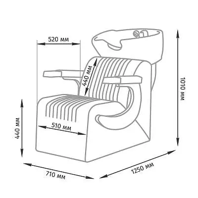 Комплектация мойки: раковина, сантехнические комплектующие, узел наклона раковины, каркас мойки, кресло, хромированные подлокотники с накладками под цвет кресла.