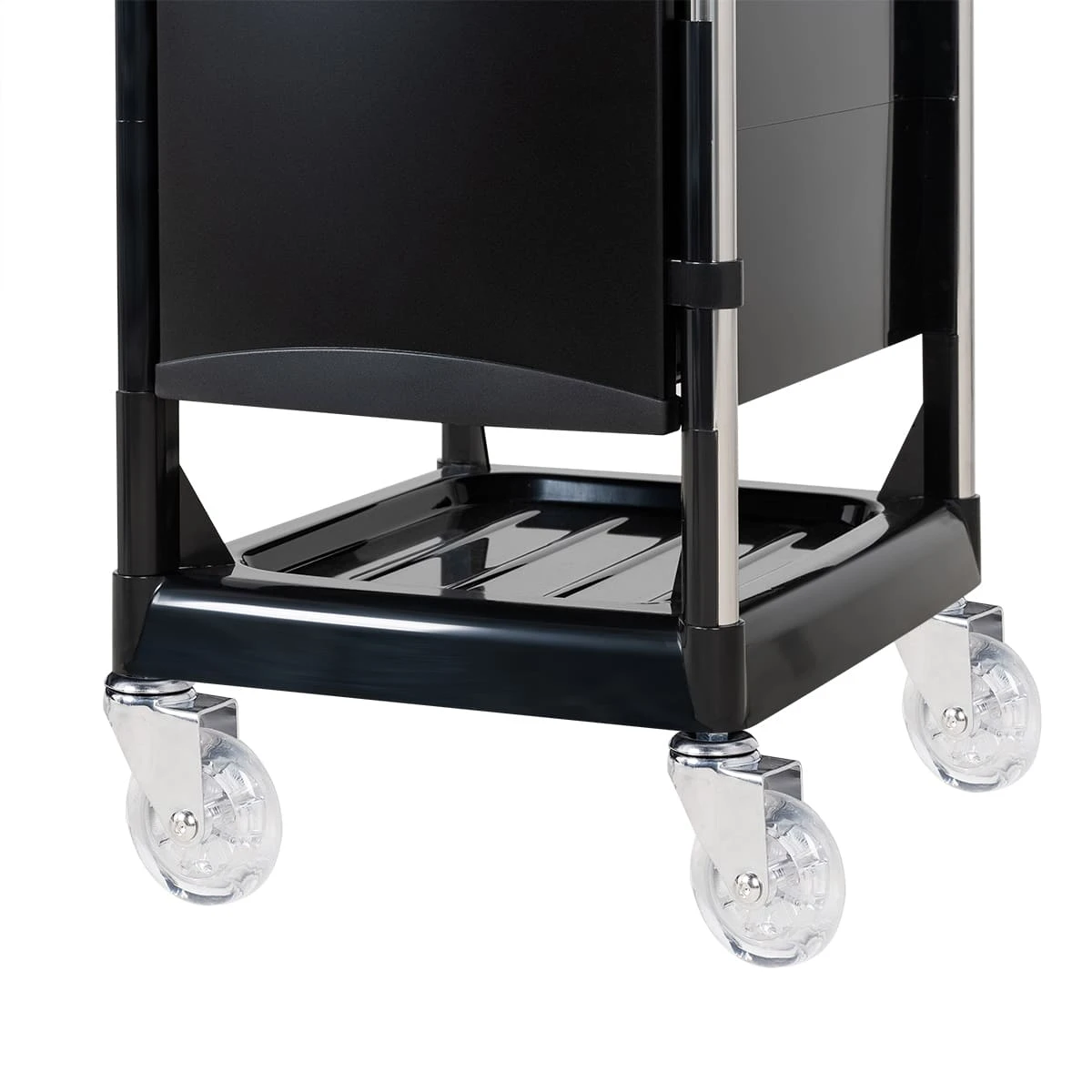 Парикмахерское оборудование изготовлено из качественных материалов. Тележка установлена на прочный металлический каркас. Для создания полочек, ящиков, закрытых боковин использован ударопрочный пластик.
