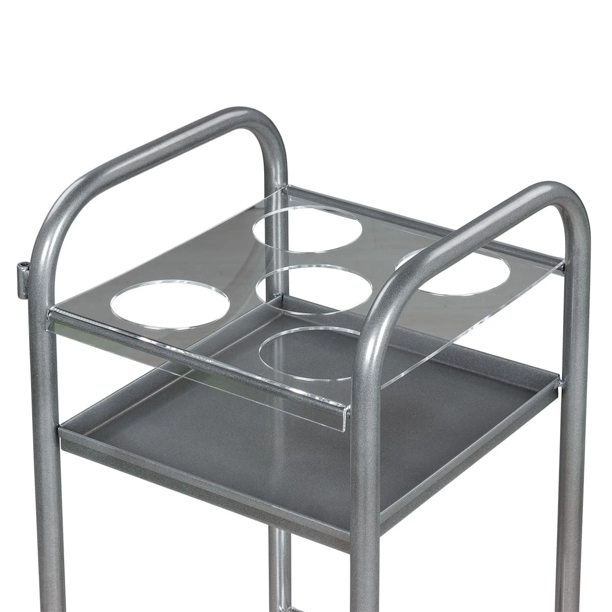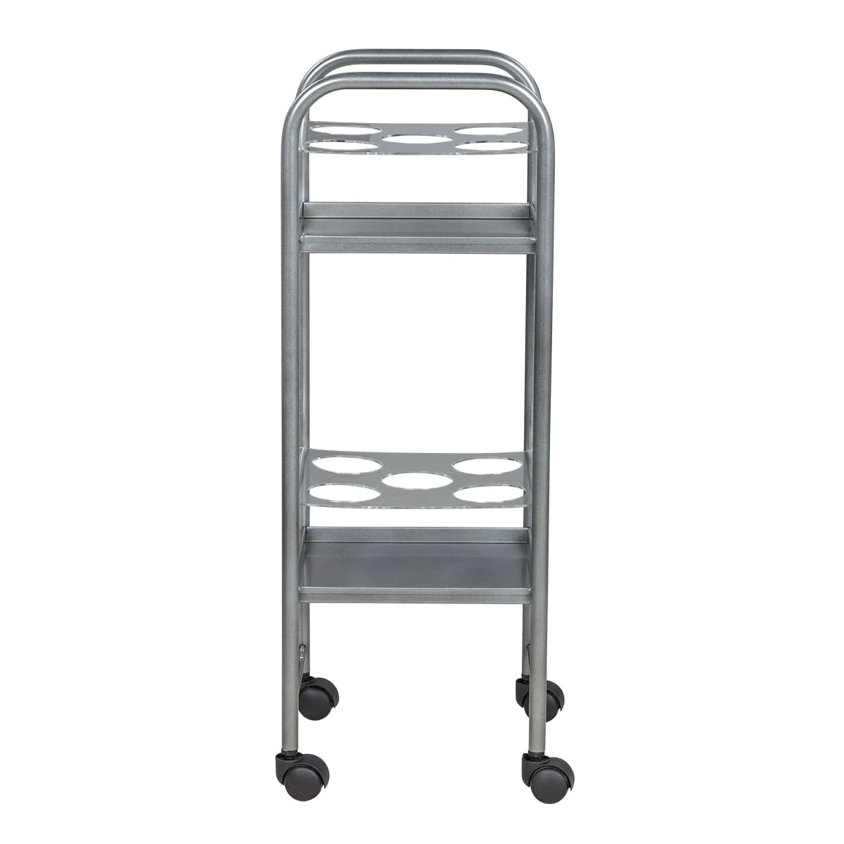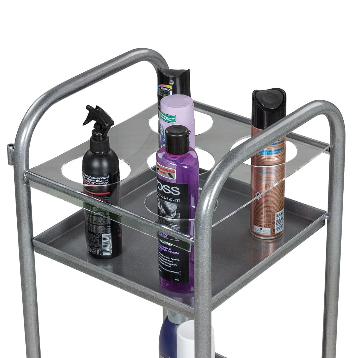 Парикмахерская тележка включает 2 полки, на которых предусмотрено по 5 отверстий для высоких флаконов. Верхние панели над полками съемные, поэтому данную модель можно использовать как обычную тележку. В конструкции нет боковых стенок, благодаря чему можно воспользоваться необходимыми средствами с любой стороны. Наличие вращающихся колес позволяет легко и плавно перемещать парикмахерское оборудование по рабочей зоне. Передвигая тележку, можно не переживать за напольное покрытие, так как колесики из пластика не повредят его.