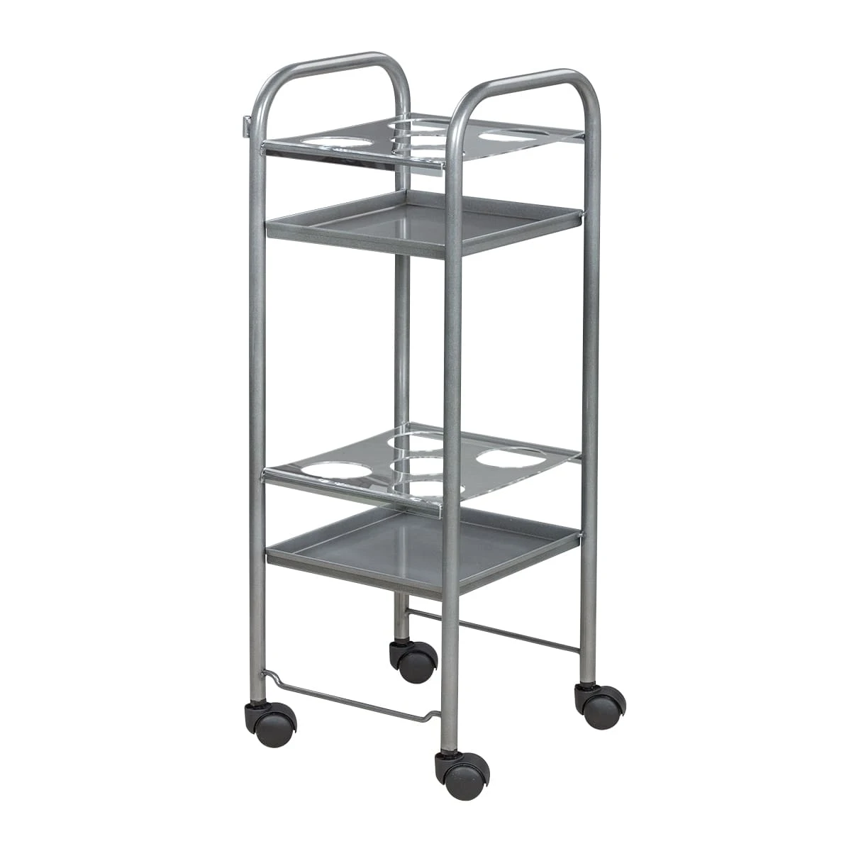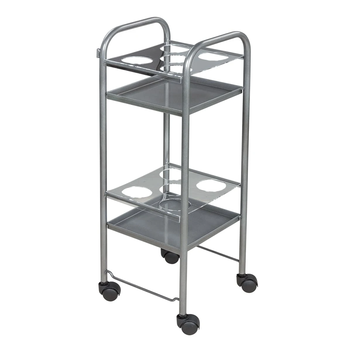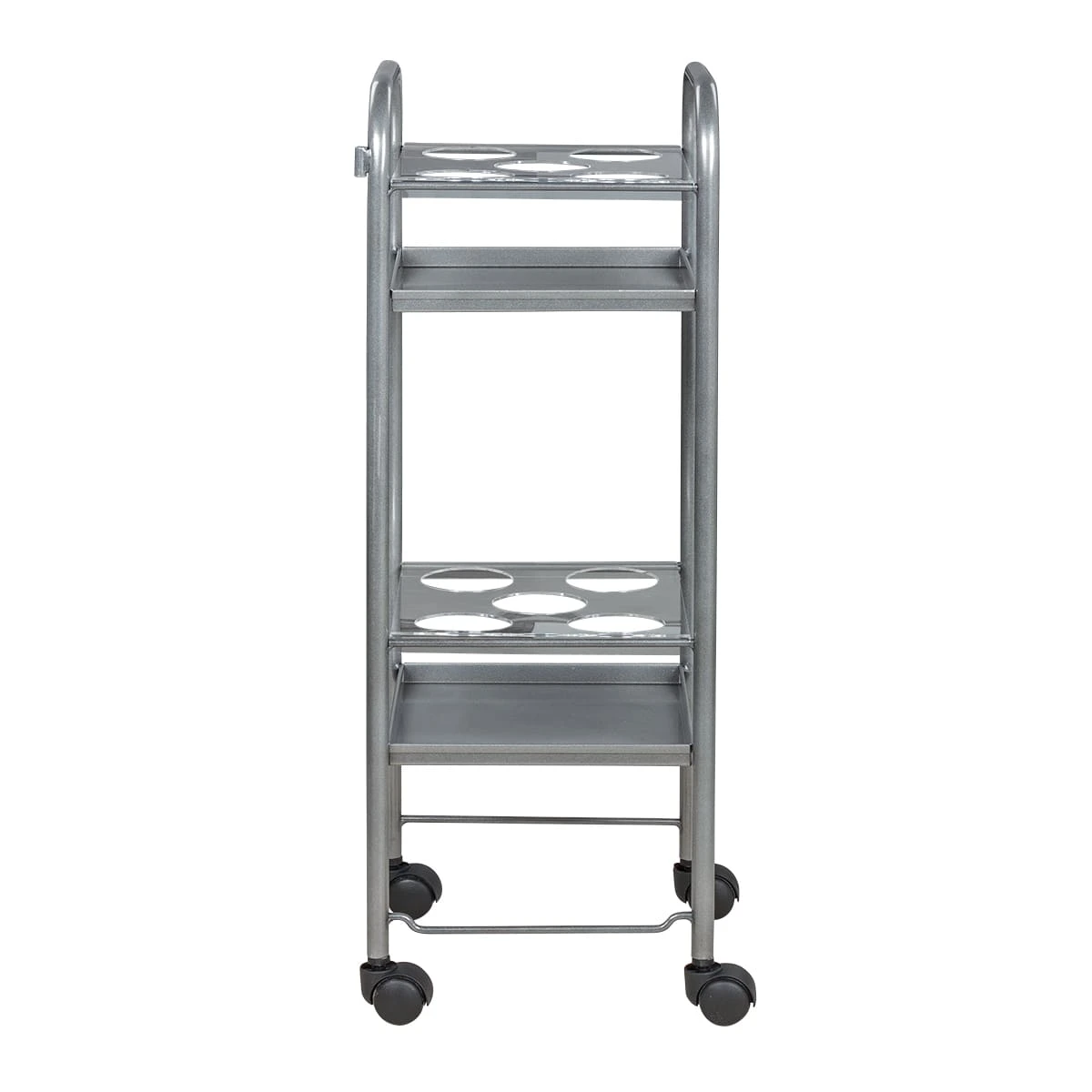 Парикмахерская тележка включает 2 полки, на которых предусмотрено по 5 отверстий для высоких флаконов. Верхние панели над полками съемные, поэтому данную модель можно использовать как обычную тележку. В конструкции нет боковых стенок, благодаря чему можно воспользоваться необходимыми средствами с любой стороны. Наличие вращающихся колес позволяет легко и плавно перемещать парикмахерское оборудование по рабочей зоне. Передвигая тележку, можно не переживать за напольное покрытие, так как колесики из пластика не повредят его.