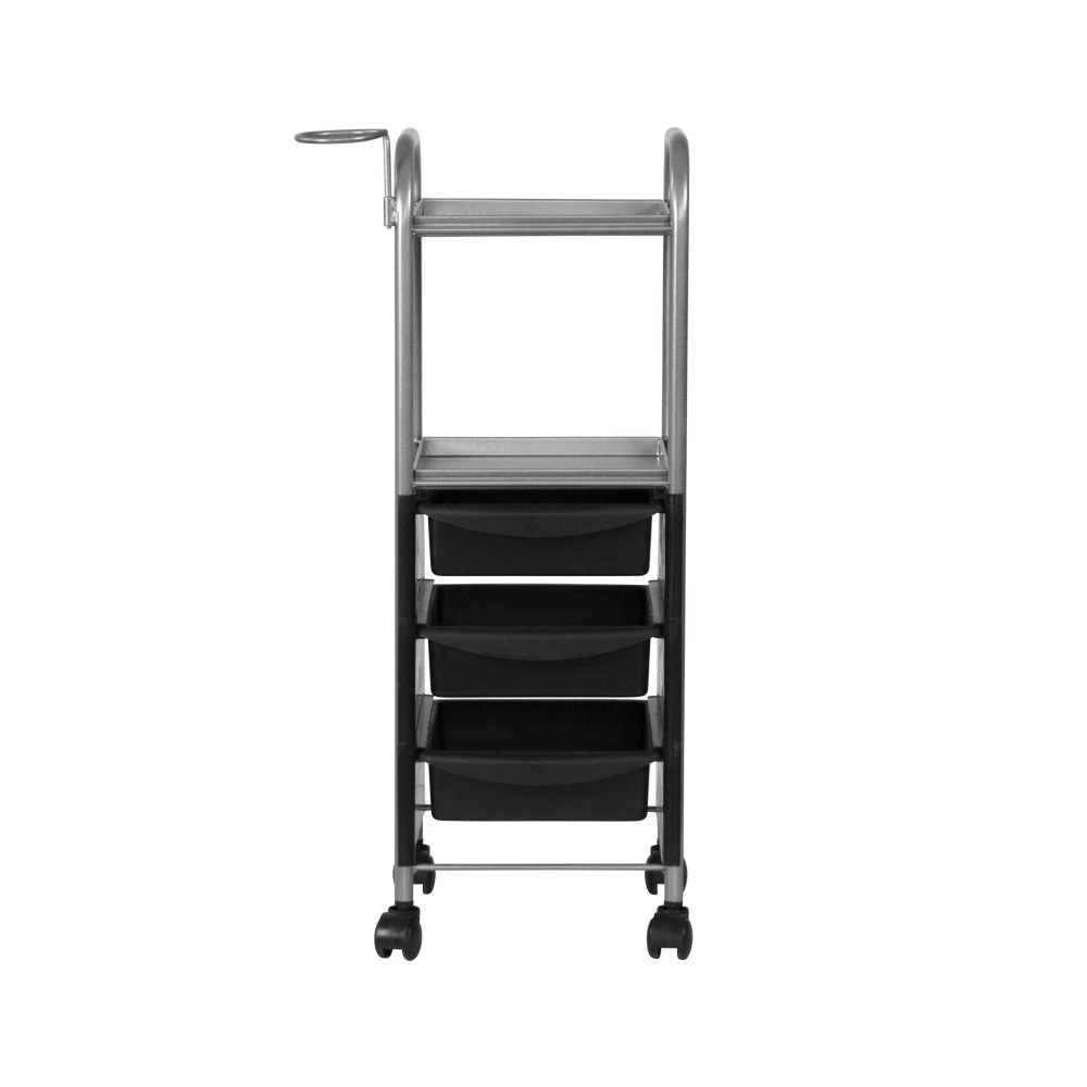 Каркас, полочки и фенодержатель изготовлены из прочного металла. Для защиты от коррозии и влаги на поверхность нанесен слой краски. Для создания боковин и ящиков использован качественный пластик устойчивый к влиянию очищающих средств. Пластиковые колеса предотвратят скольжение конструкции.