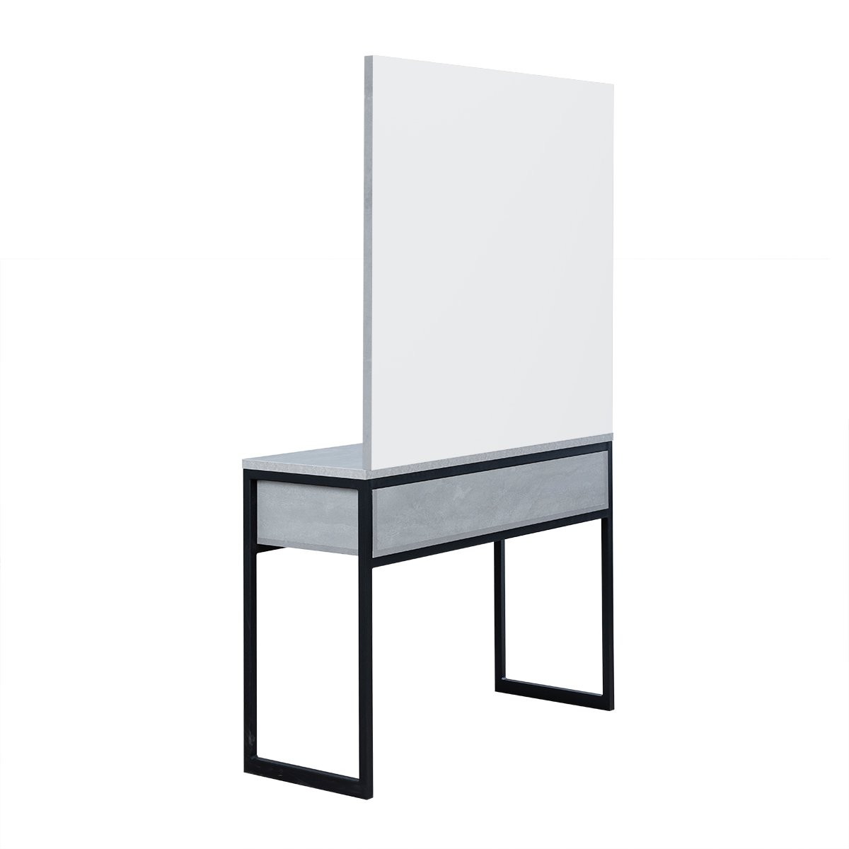 Парикмахерское рабочее место выполнено в современном стиле с гармоничным сочетанием светлого дерева и чёрного металла. Большое зеркало в широкой раме визуально расширяет пространство и позволяет мастеру контролировать процесс работы под любым углом.