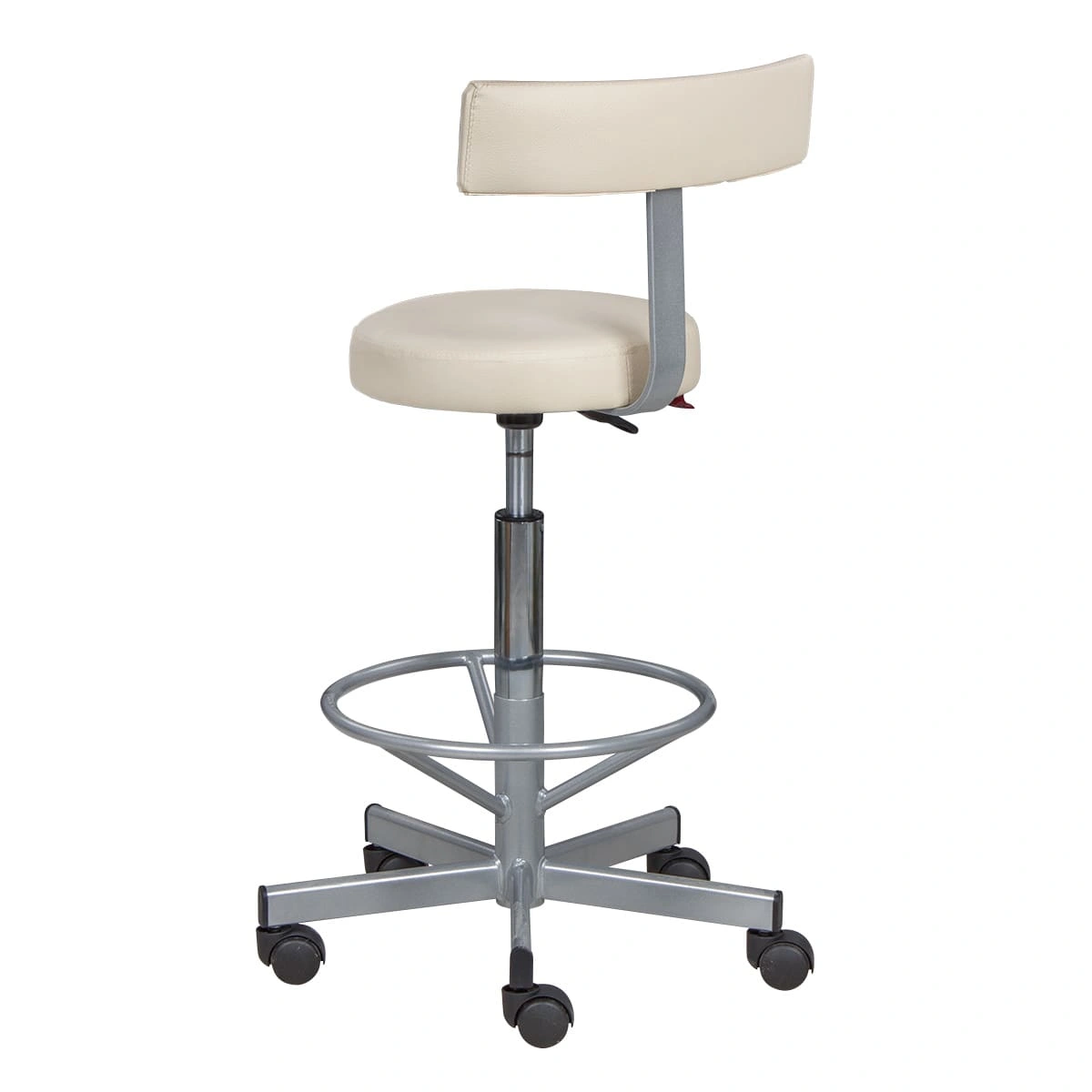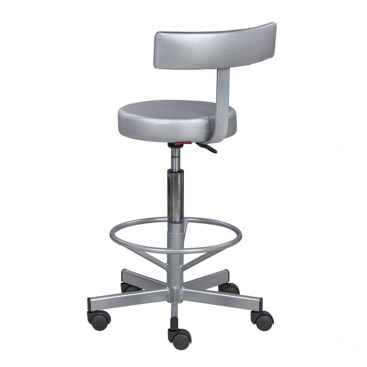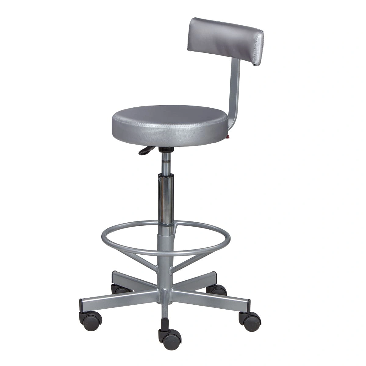 Сиденье со спинкой обеспечит мастеру удобства, необходимые для комфортной работы. Удобная опора предназначена для комфорта ног специалиста. Надежный пневматический механизм позволяет подобрать желаемую высоту сиденья для разных процедур. Маневренные колесики отвечают за легкое и бесшумное перемещение парикмахерского оборудования.