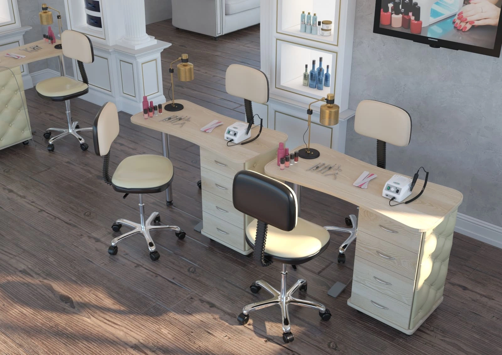 Во время работы мастеру по педикюру, как и другим специалистам beauty салонов, необходимо свободно перемещаться в рабочей зоне, поэтому стул должен быть мобильным. Для этого основание модели Сеньор комплектуется вращающимися пластиковыми колесами. Само пятилучье изготовлено из прочного металла с хромированным покрытием. Оно выдерживает рабочие нагрузки, делает стул устойчивым и выгодно подчеркивает его дизайн. Регулировка по высоте осуществляется с помощью надежного пневматического подъемника (газлифта).