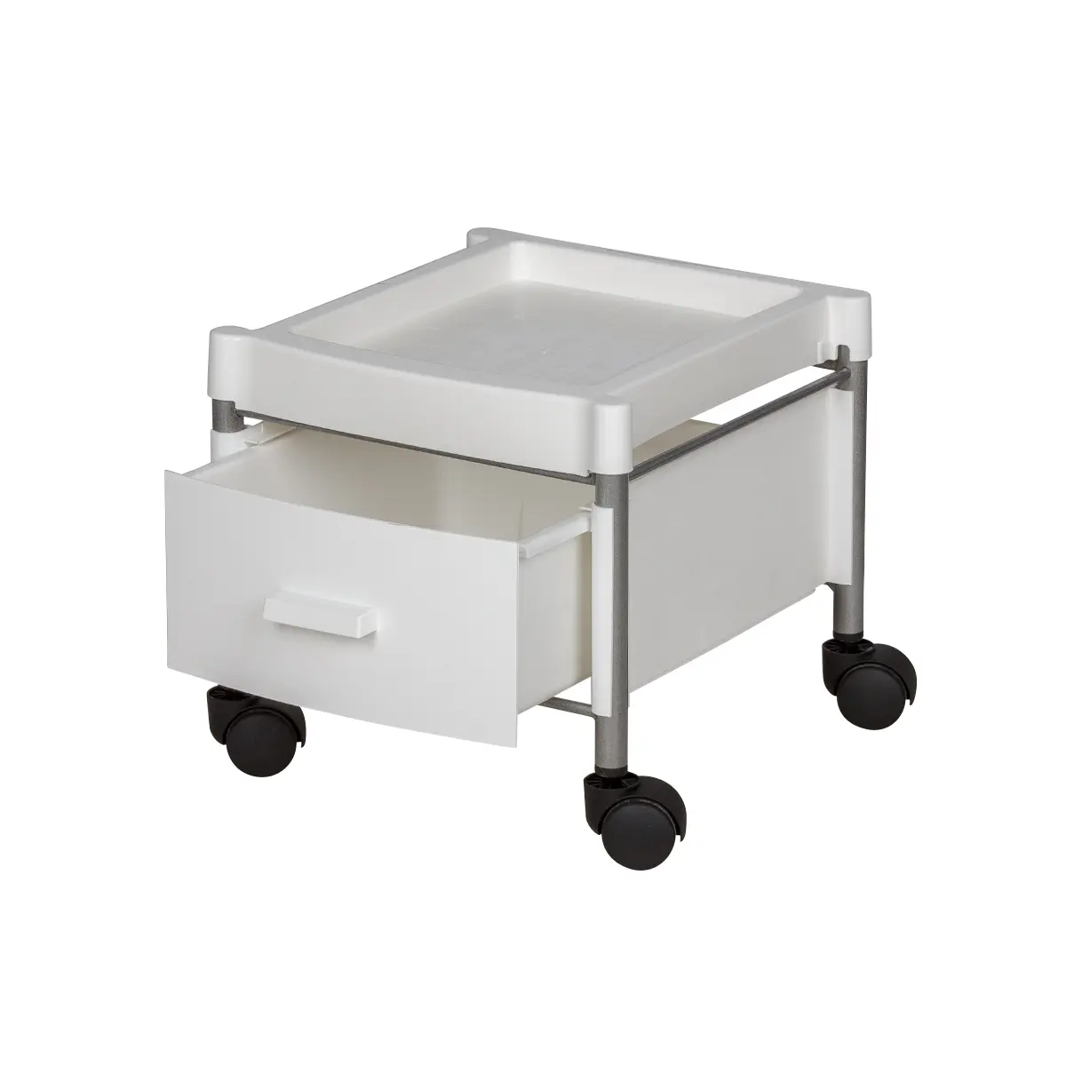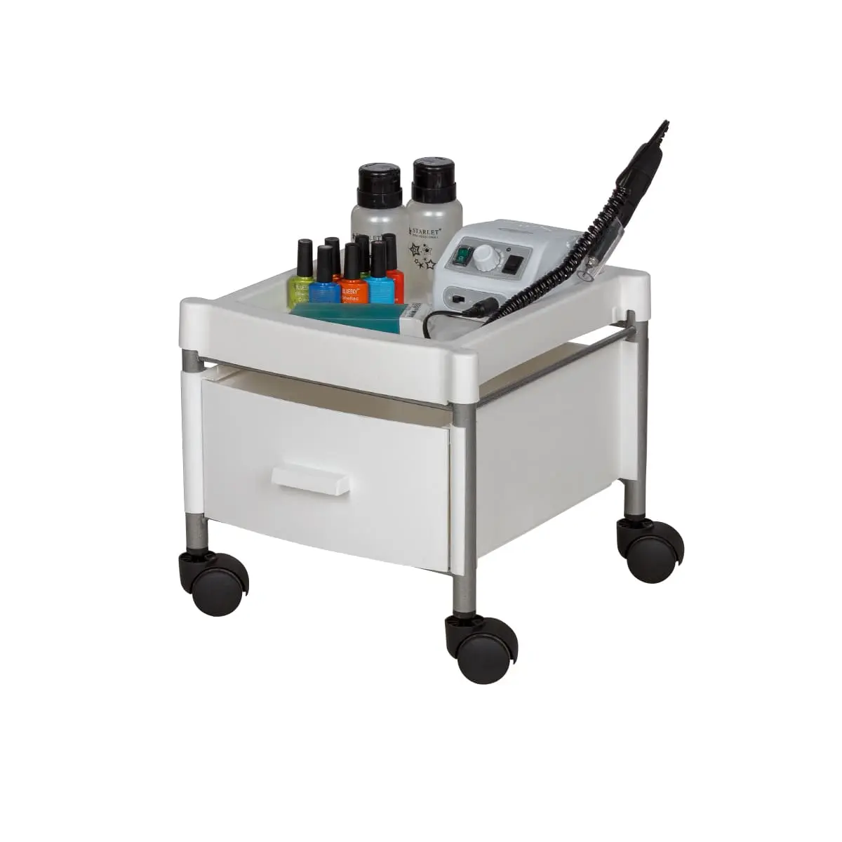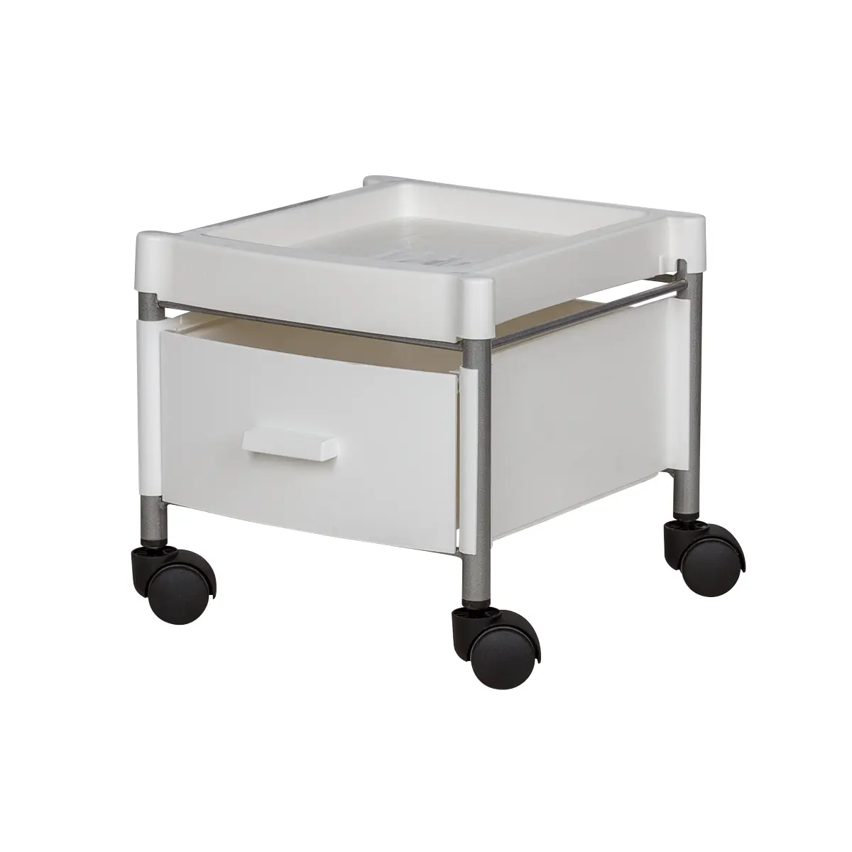 Каркас тележки – стальные трубки, надёжно защищённые от коррозии и влаги. Боковые панели, крышка и ящик выполнены из ударопрочного пластика. Материал легко очищается с помощью моющих и дезинфицирующих средств, не деформируется при случайном попадании косметических веществ. Колеса из качественного пластика не оставят ни единой царапину на полу помещения.
