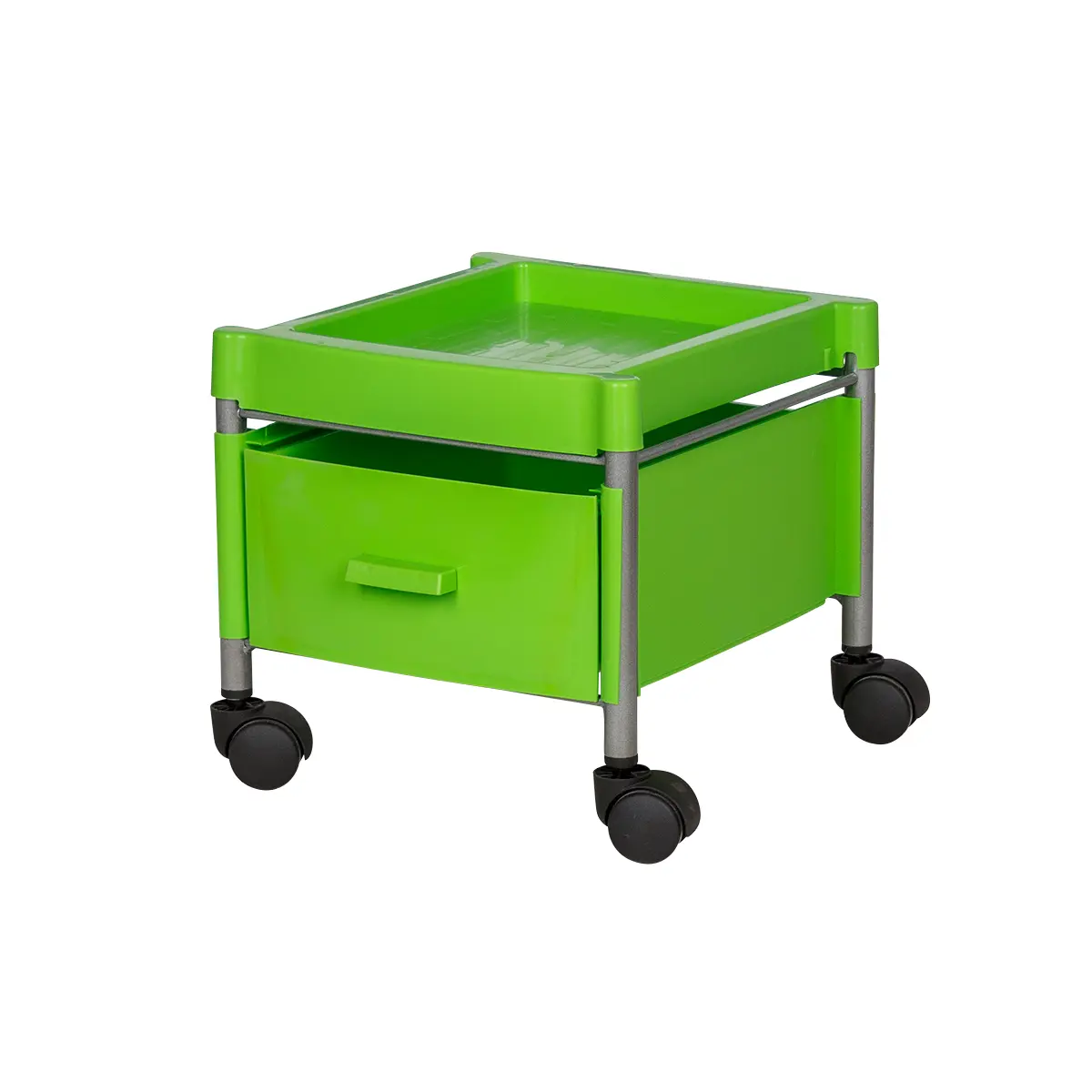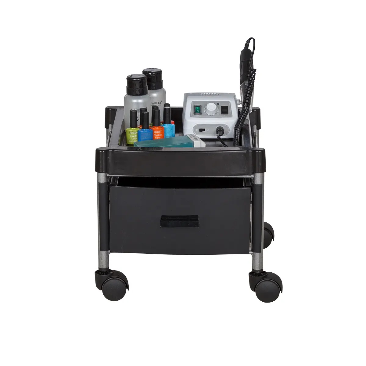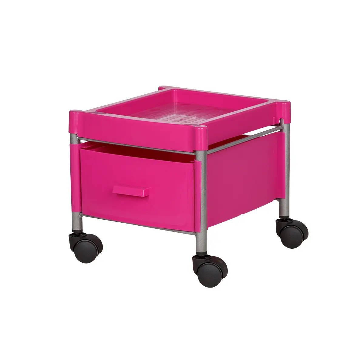 Каркас тележки – стальные трубки, надёжно защищённые от коррозии и влаги. Боковые панели, крышка и ящик выполнены из ударопрочного пластика. Материал легко очищается с помощью моющих и дезинфицирующих средств, не деформируется при случайном попадании косметических веществ. Колеса из качественного пластика не оставят ни единой царапину на полу помещения.