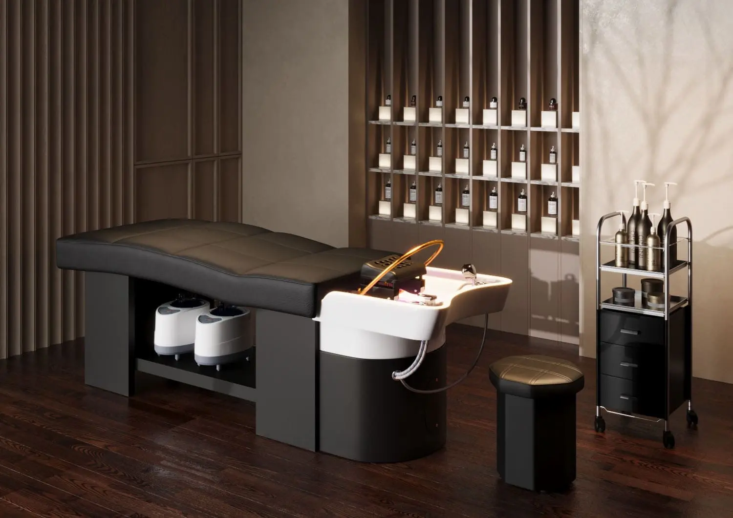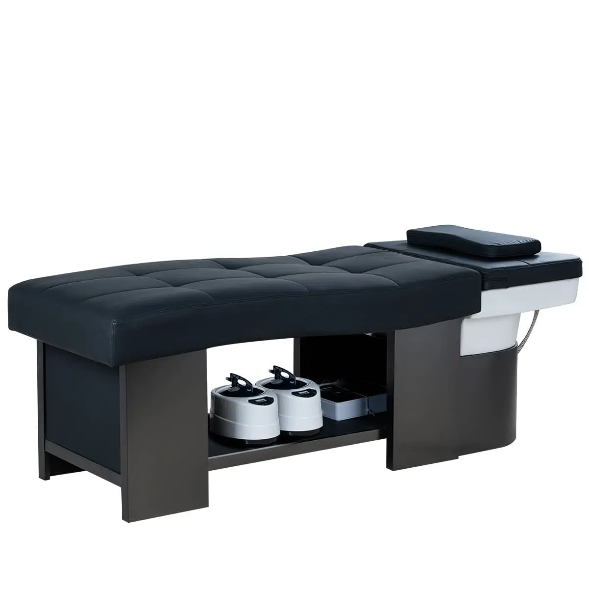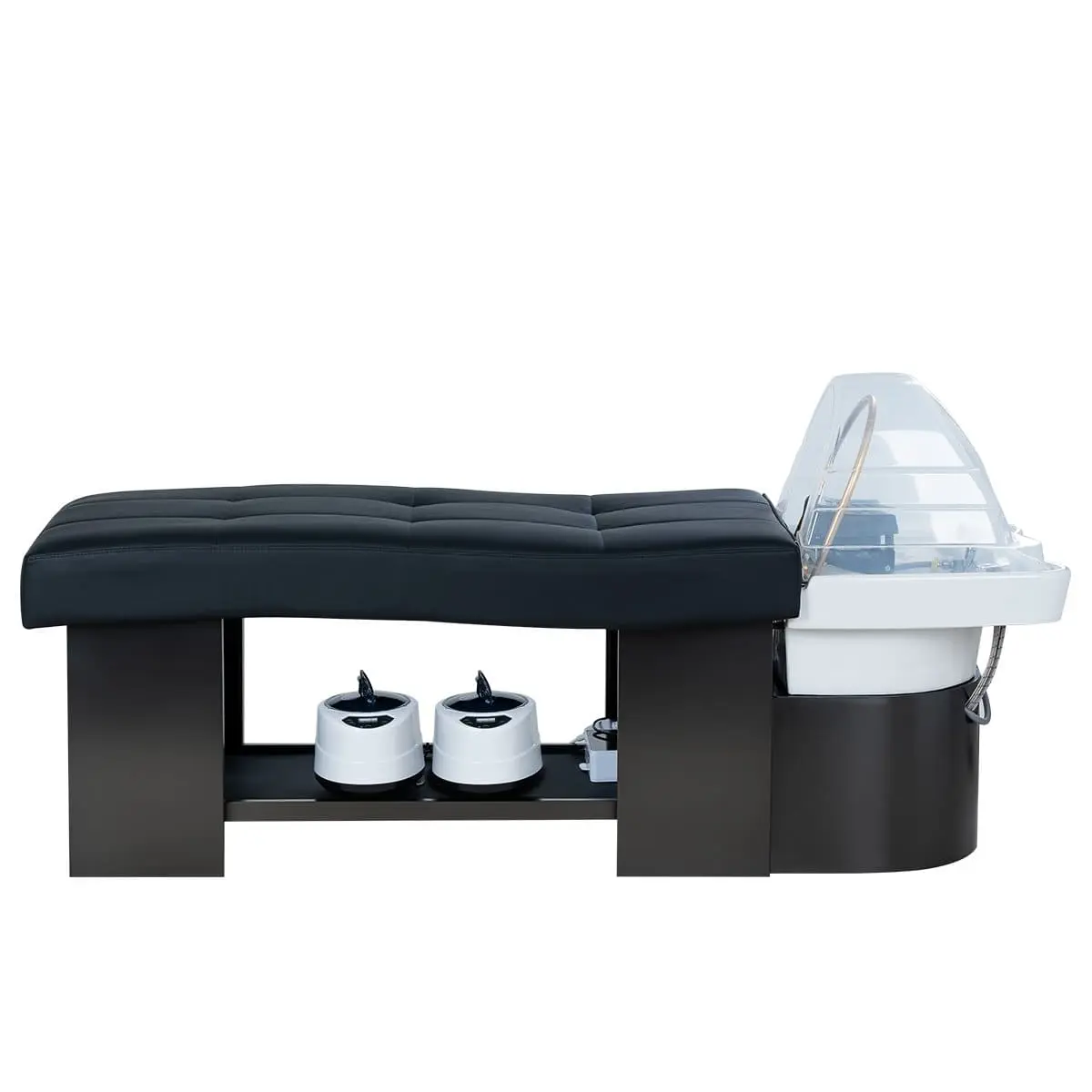 МД-616 — спа-кушетка для процедуры head spa, которая стремительно набирает популярность. Удобное изогнутое ложе мягко поддерживает тело, создавая ощущение невесомости, металлический каркас обеспечивает надёжность и устойчивость, сенсорная переносная панель позволяет мастеру легко регулировать функции, полка под кушеткой — для удобного размещения аксессуаров, а дуга для аква-массажа дарит роскошный водный релакс.