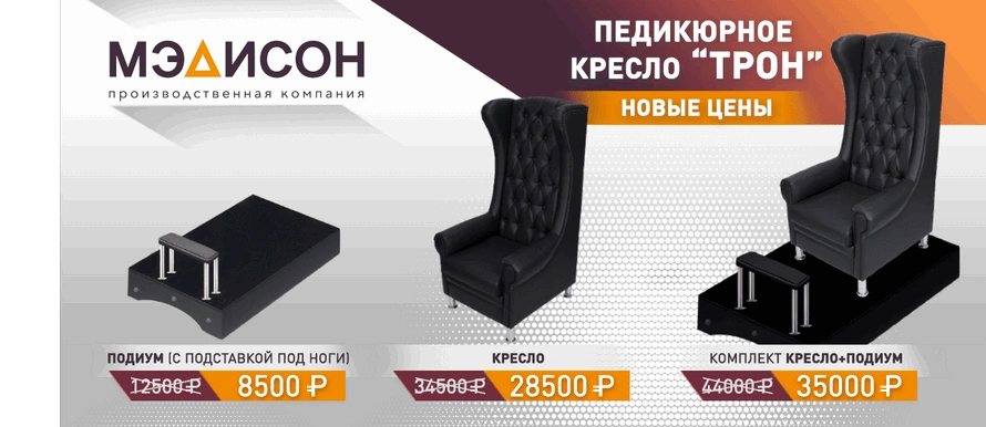 Экономьте вместе с компанией МЭДИСОН! Специально для наших клиентов выгодное предложение – педикюрное кресло Трон по очень привлекательной цене! Снижение цен предлагаем на модели: